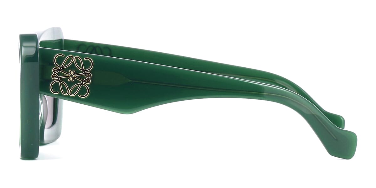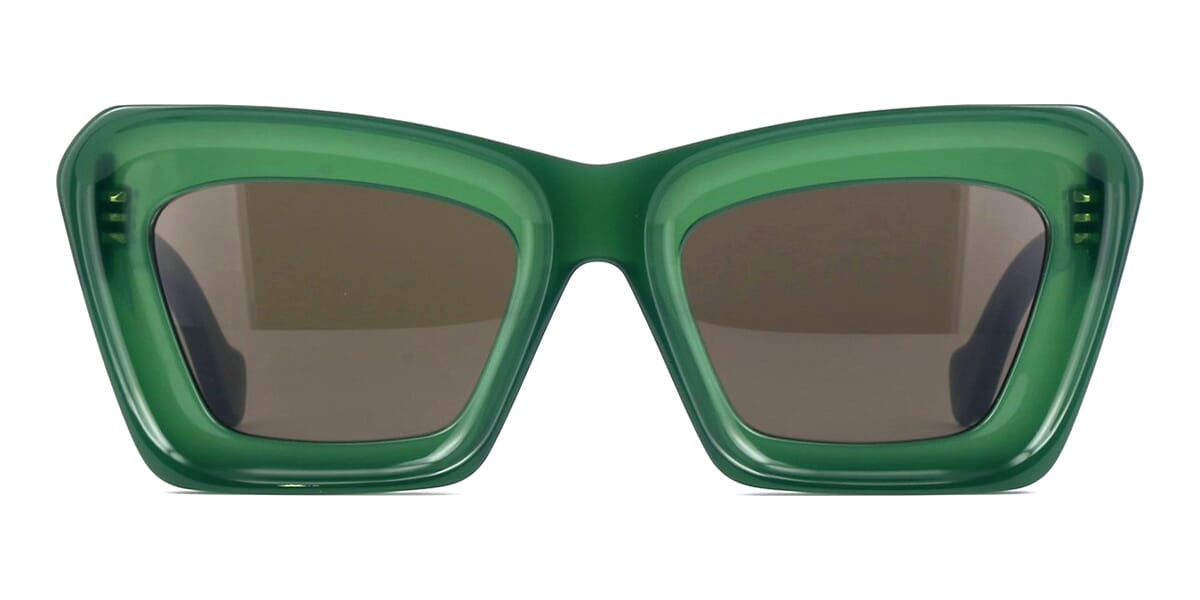 This cat eye Loewe sunglass comes in a shiny green crystal frame with light brown lenses.
