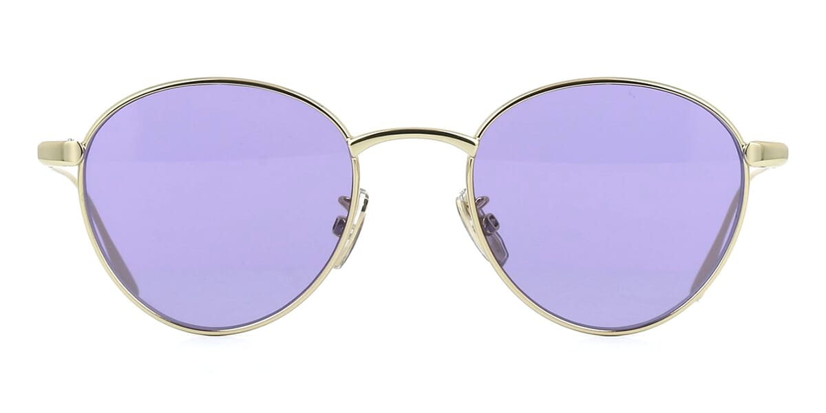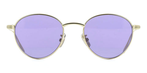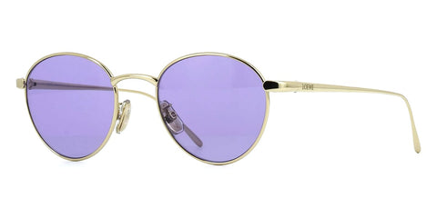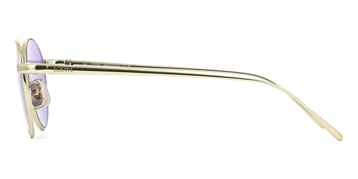 This round Loewe sunglass comes in a shiny gold frame with purple with light mirror lenses.