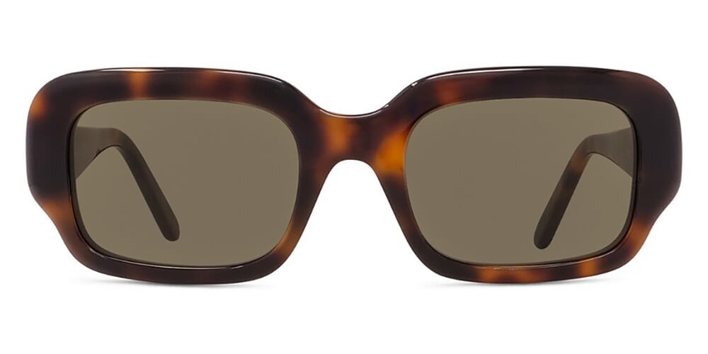 This square Loewe sunglass comes in a shiny brown havana frame with green lenses.