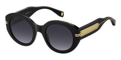 This square Marc Jacobs sunglass comes in a black with gold frame with dark grey gradient lenses.