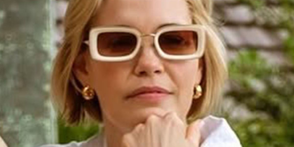 This rectangular Matsuda sunglass comes in a brushed gold with milk white frame with brown gradient lenses.