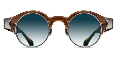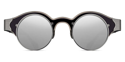 This round Matsuda sunglass comes in a antique silver frame with grey solid tint lenses.