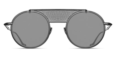 This round Matsuda sunglass comes in a matte black iron frame with grey lenses.