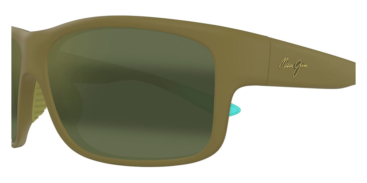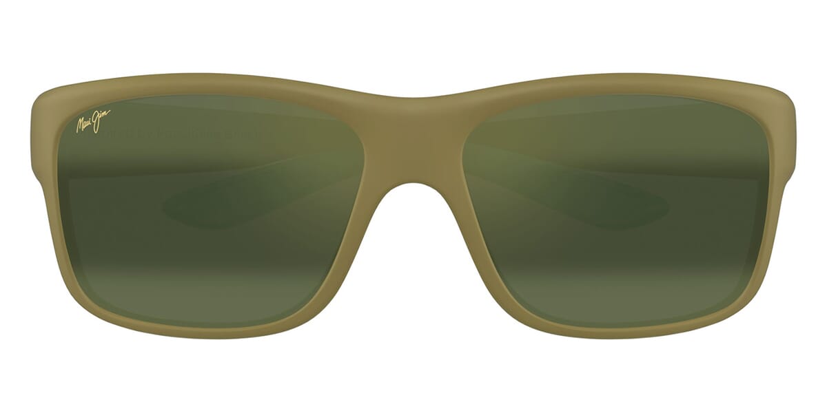 This wraparound Maui Jim sunglass comes in a matte solid green frame with maui hta super thin glass lenses.
