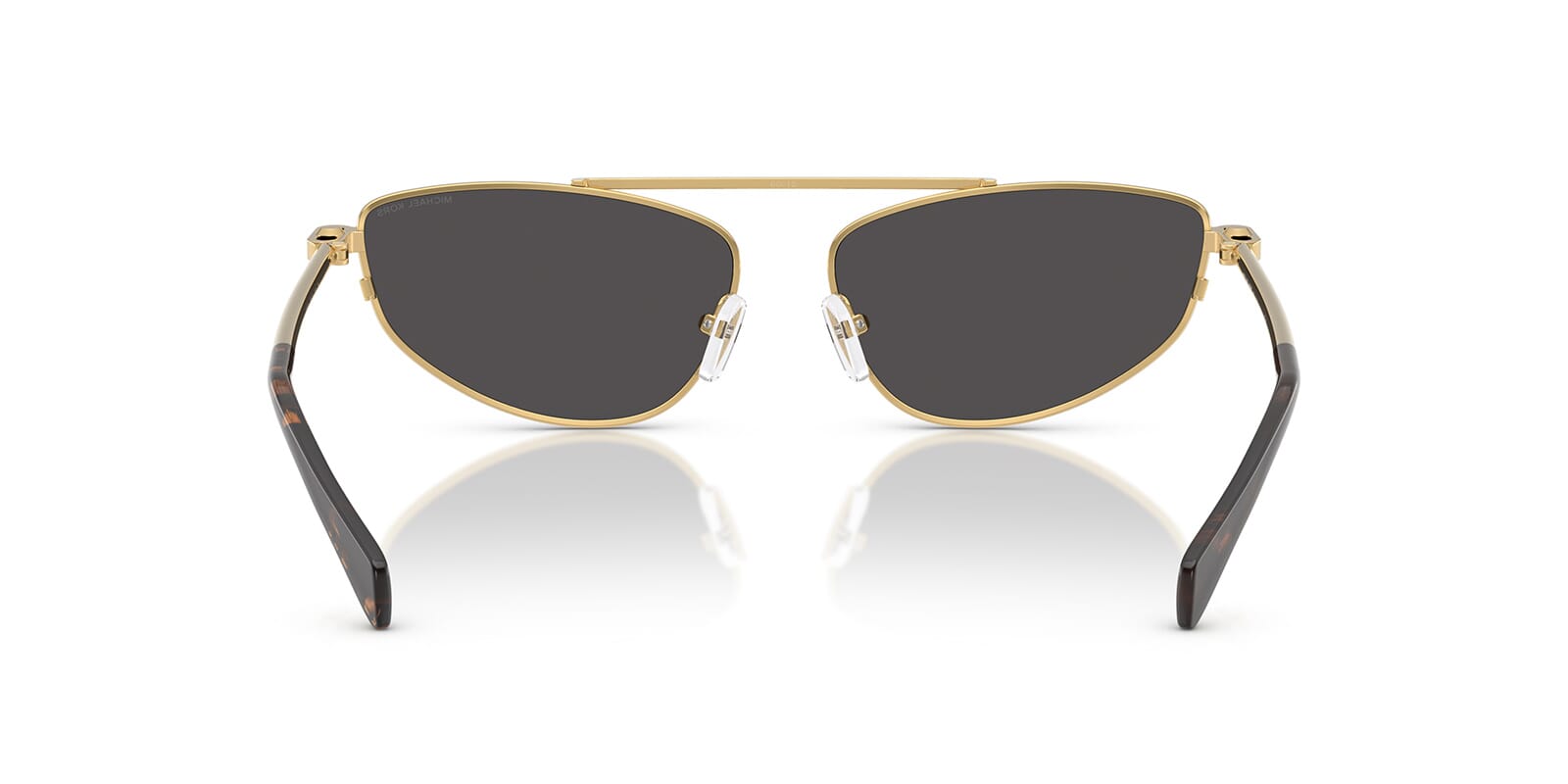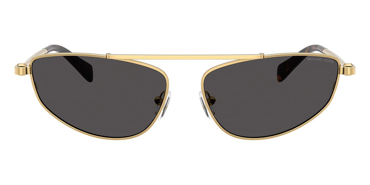 This cat eye Michael Kors sunglass comes in a shiny yellow gold frame with dark grey solid lenses.