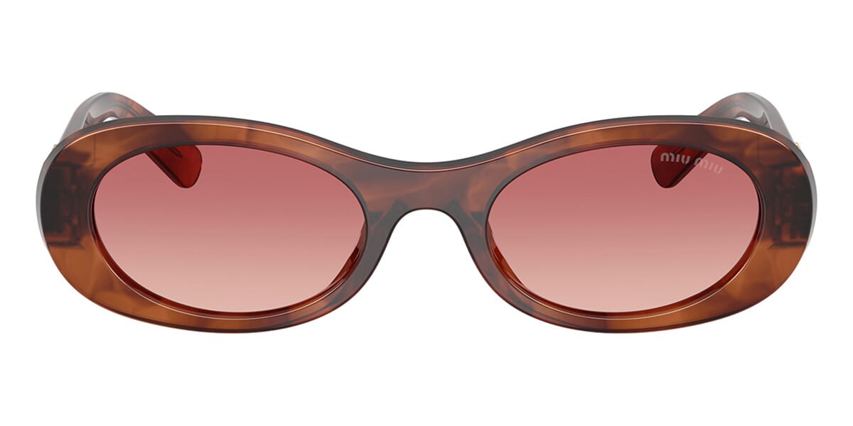 This round Miu Miu sunglass comes in a striped tobacco frame with red to pink gradient lenses.