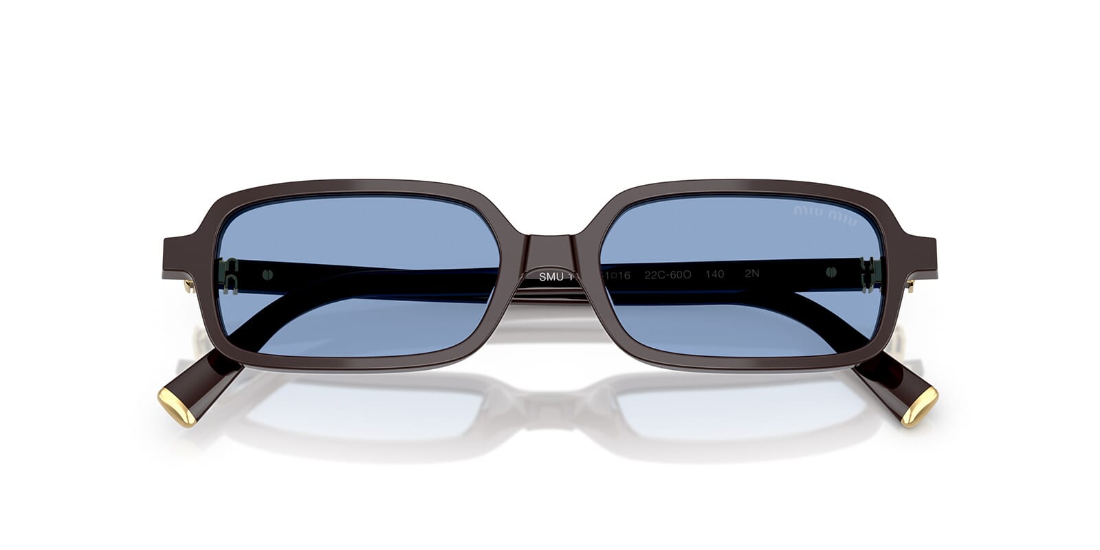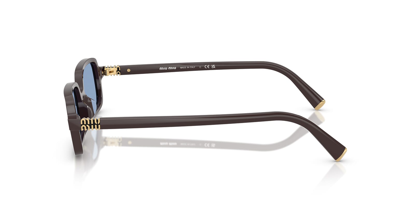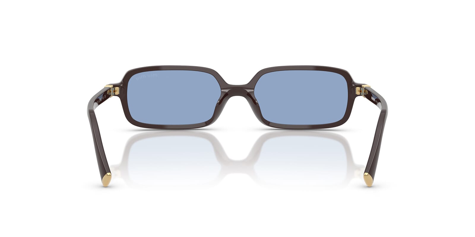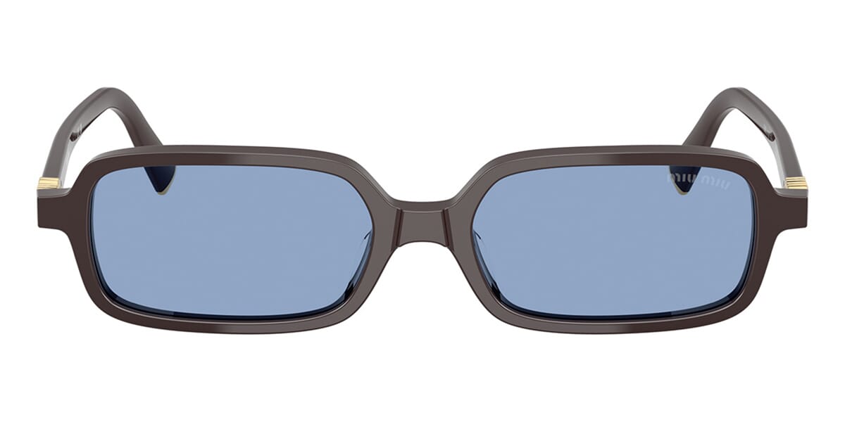 This rectangular Miu Miu sunglass comes in a moka frame with light blue lenses.