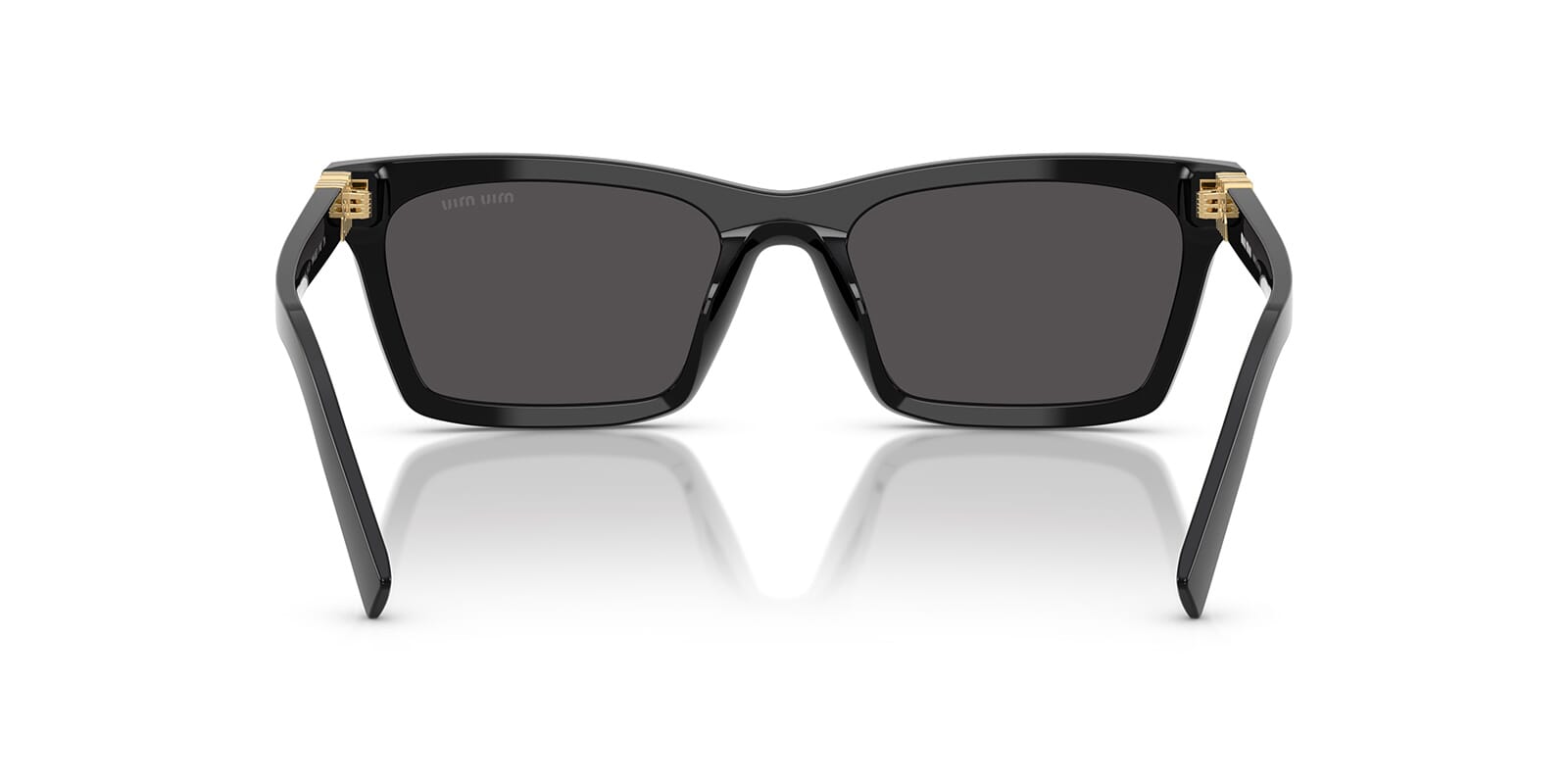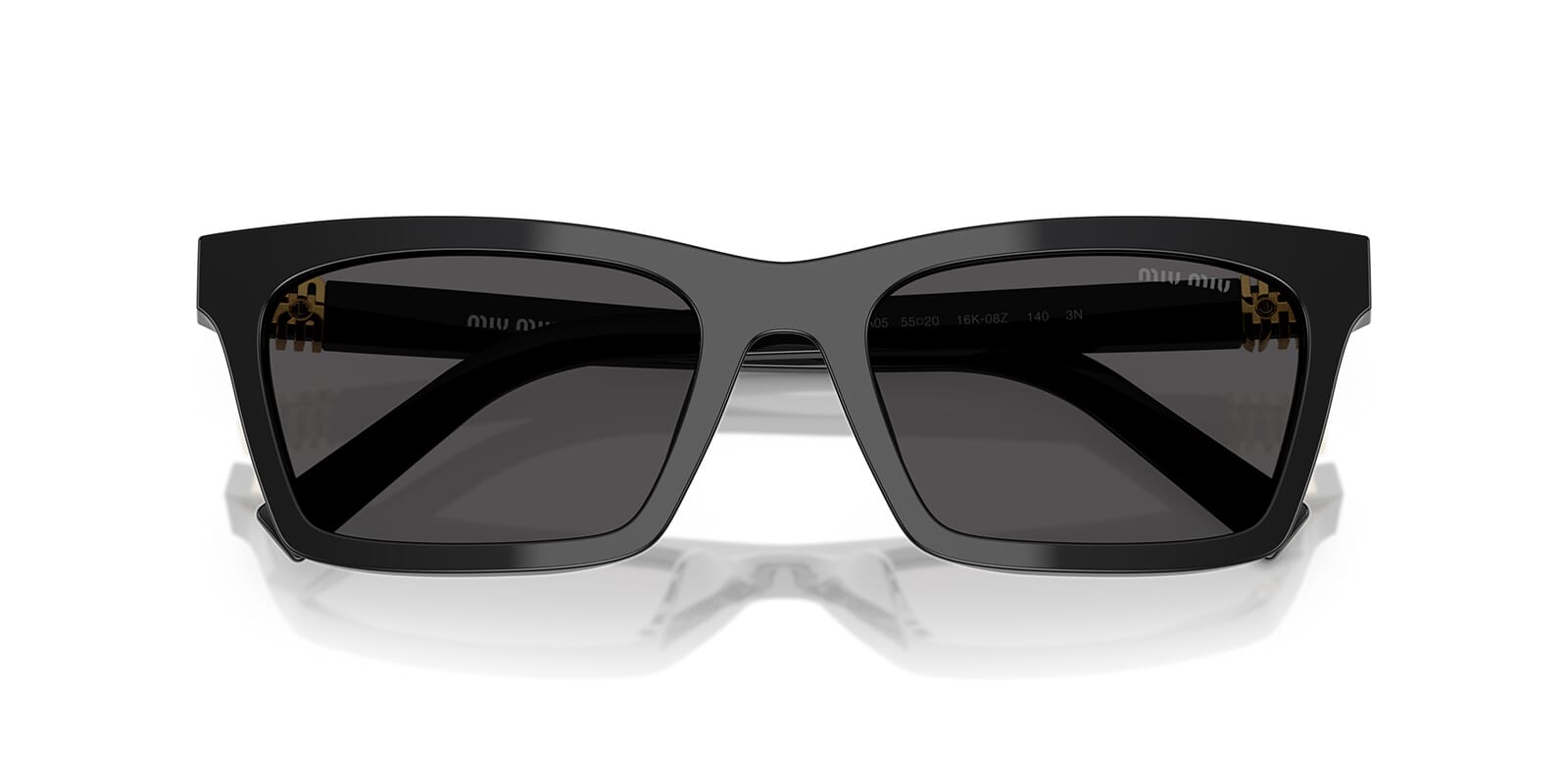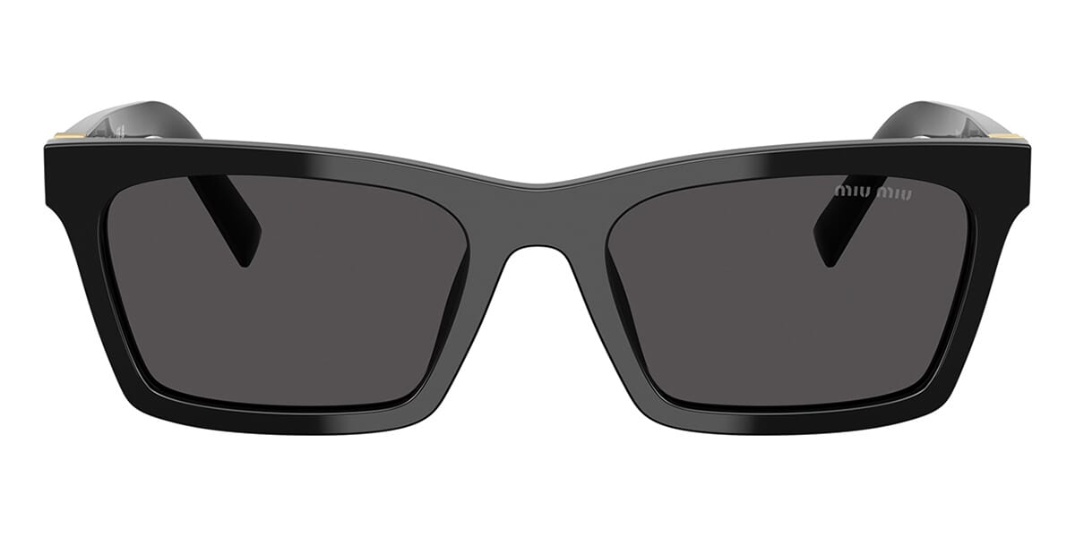 This rectangular Miu Miu sunglass comes in a black frame with dark grey lenses.