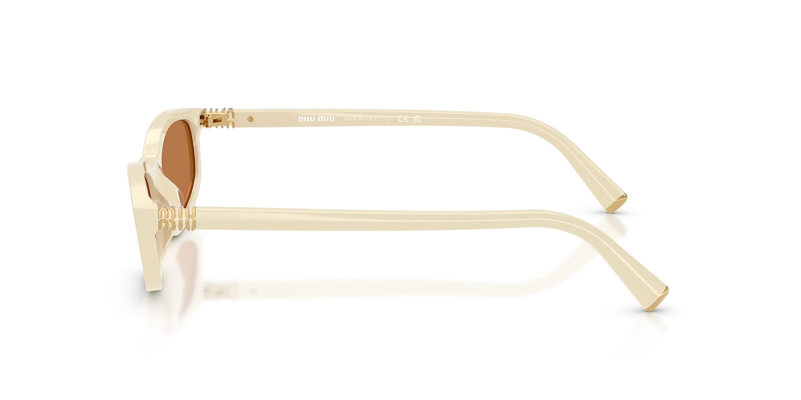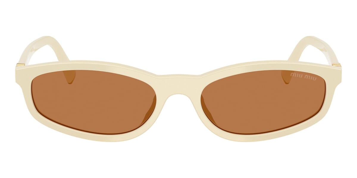 This rectangular Miu Miu sunglass comes in a milk frame with brown lenses.