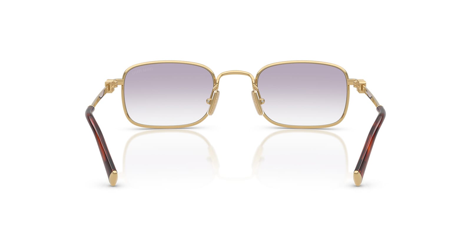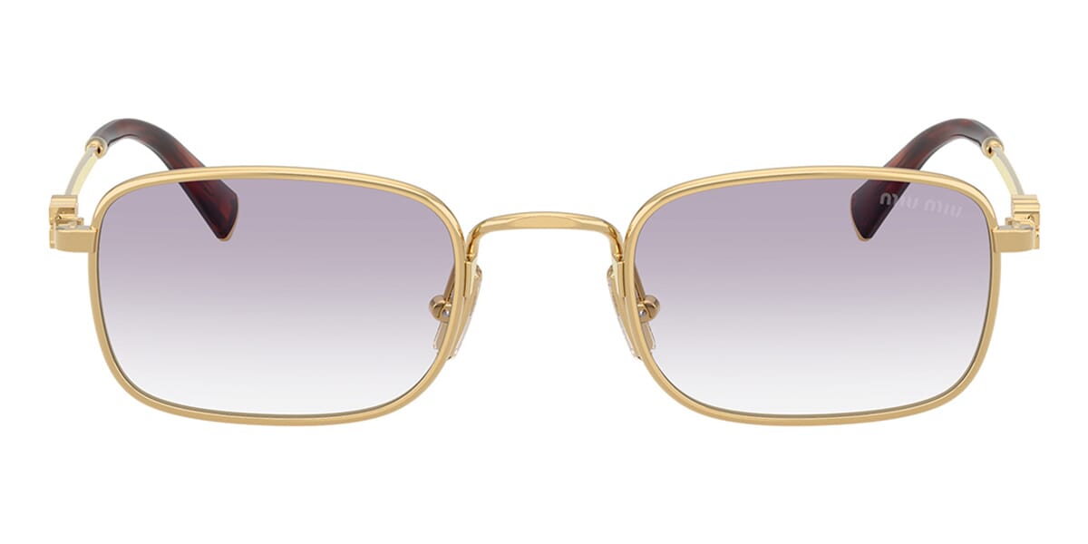 This rectangular Miu Miu sunglass comes in a gold frame with dark grey to clear gradient lenses.