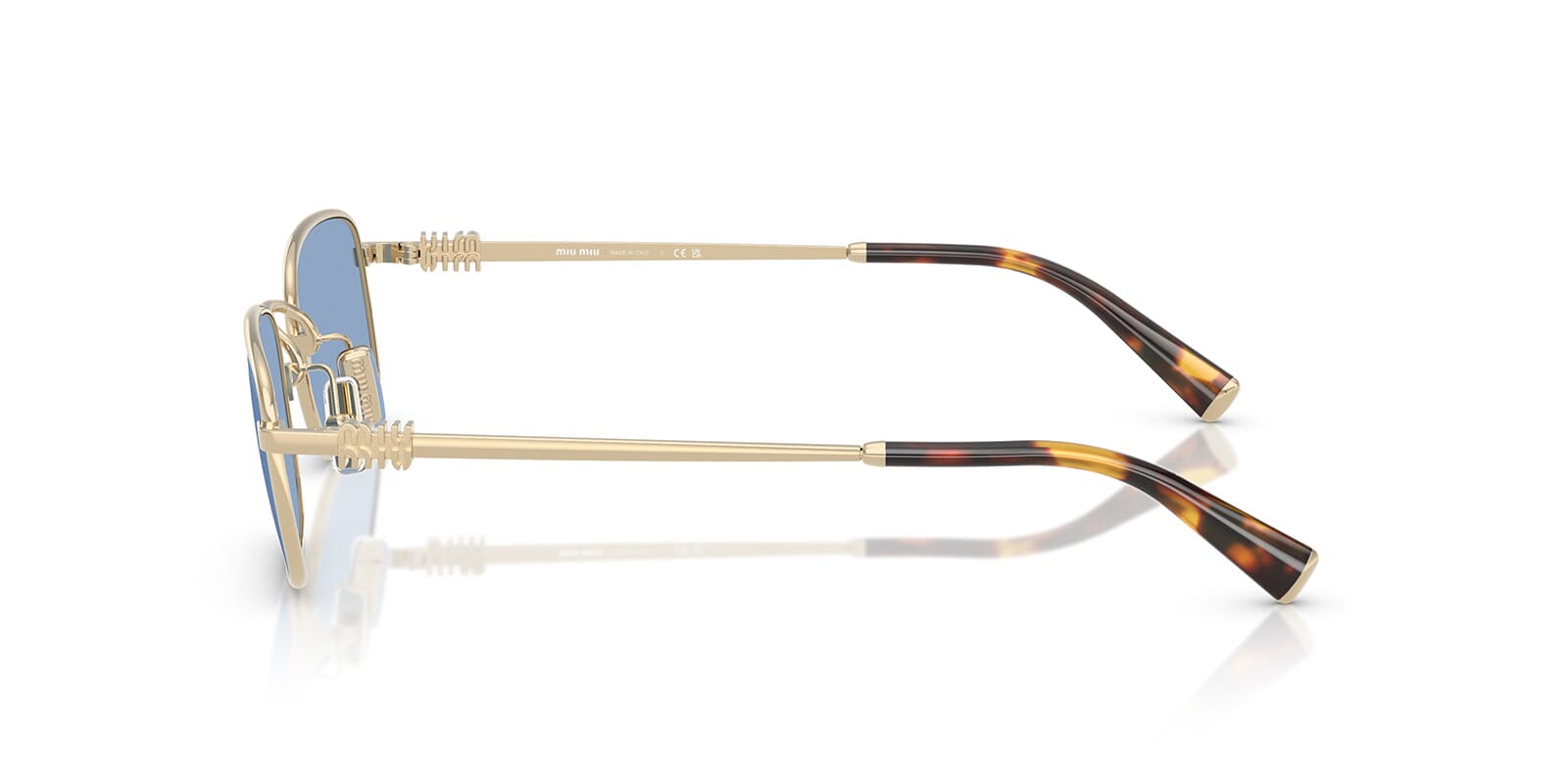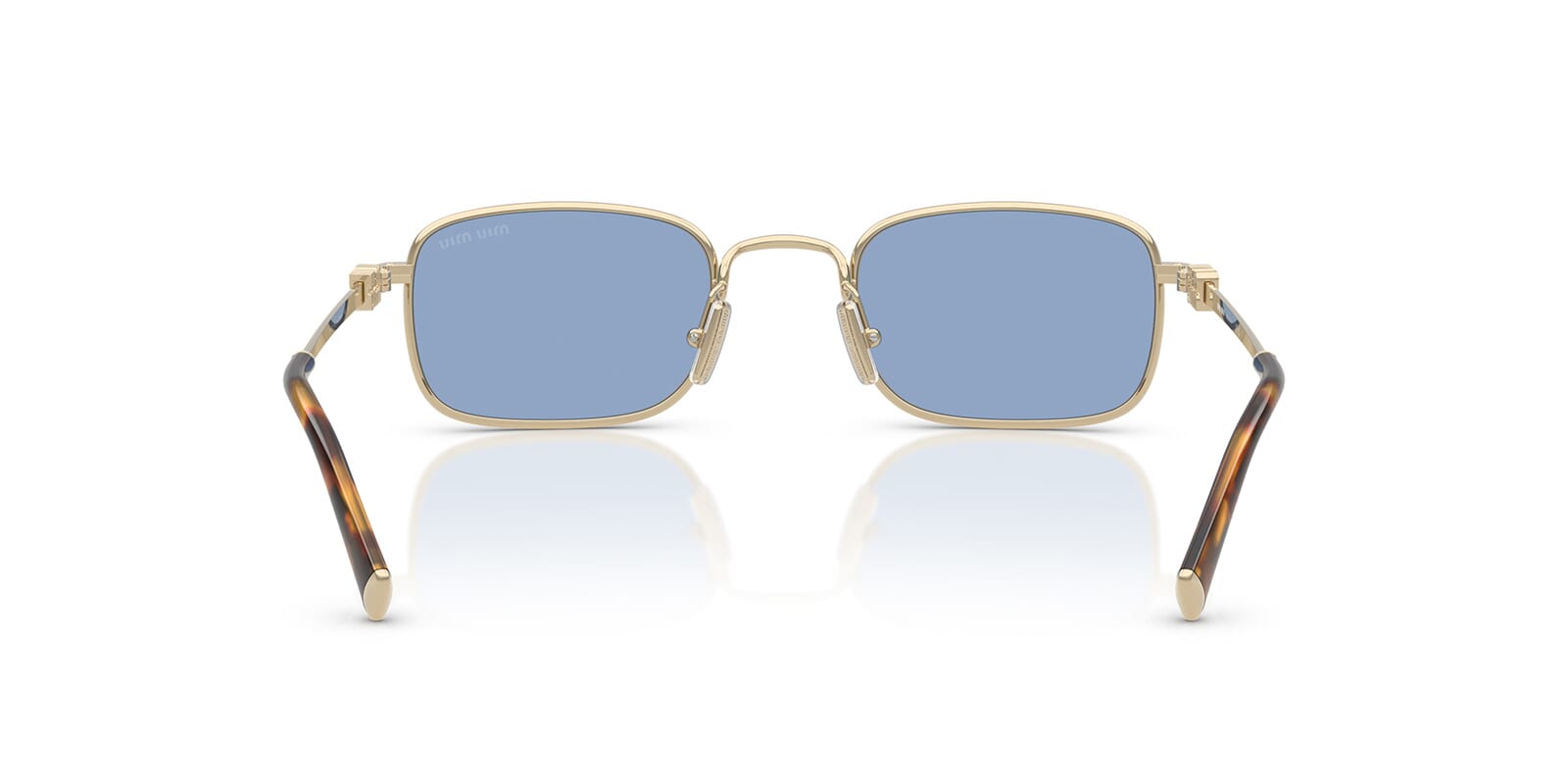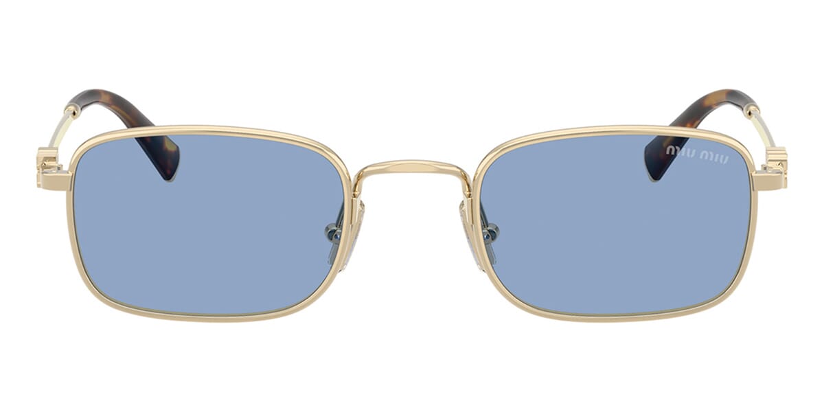 This rectangular Miu Miu sunglass comes in a pale gold frame with light blue lenses.
