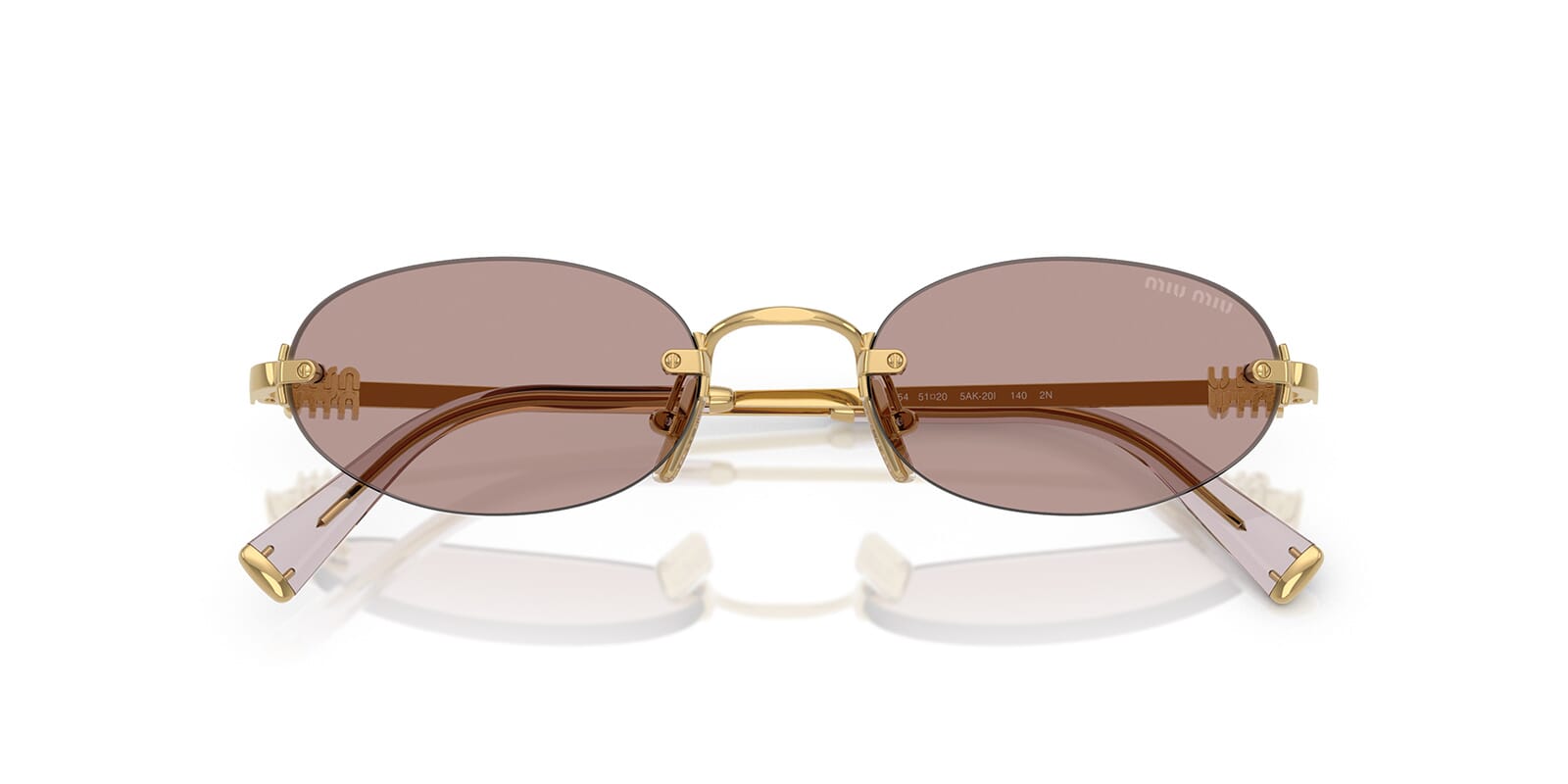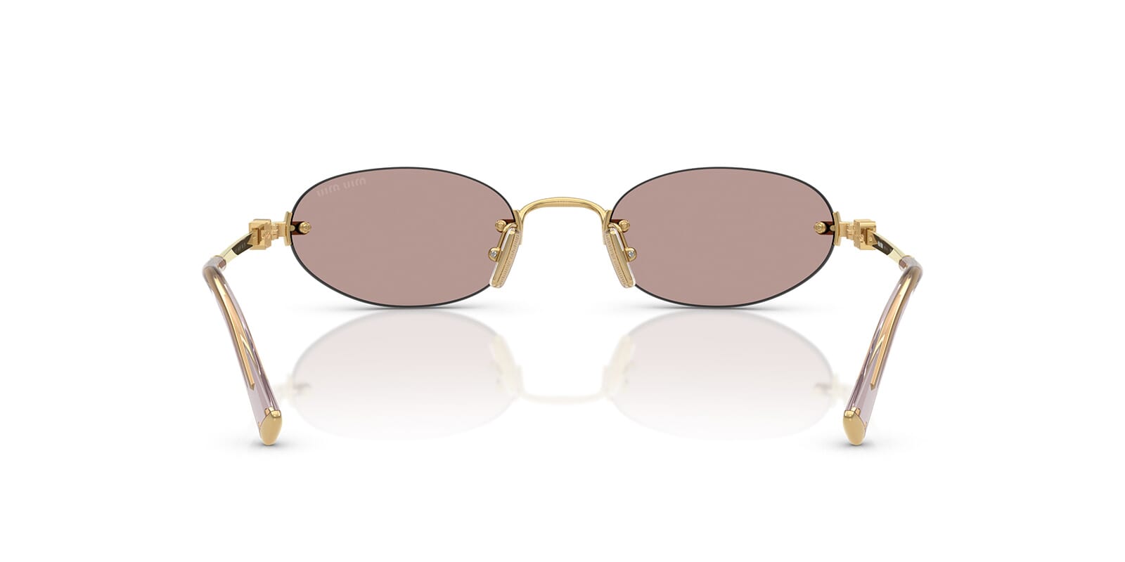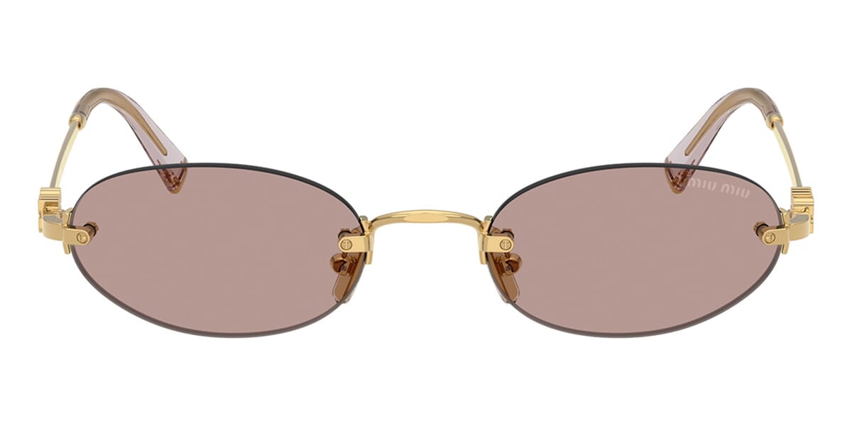 This round Miu Miu sunglass comes in a gold frame with light purple brown lenses.