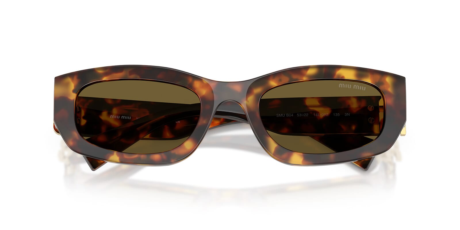 This rectangular Miu Miu sunglass comes in a havana honey frame with dark brown lenses.
