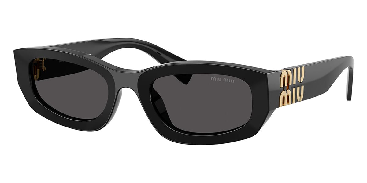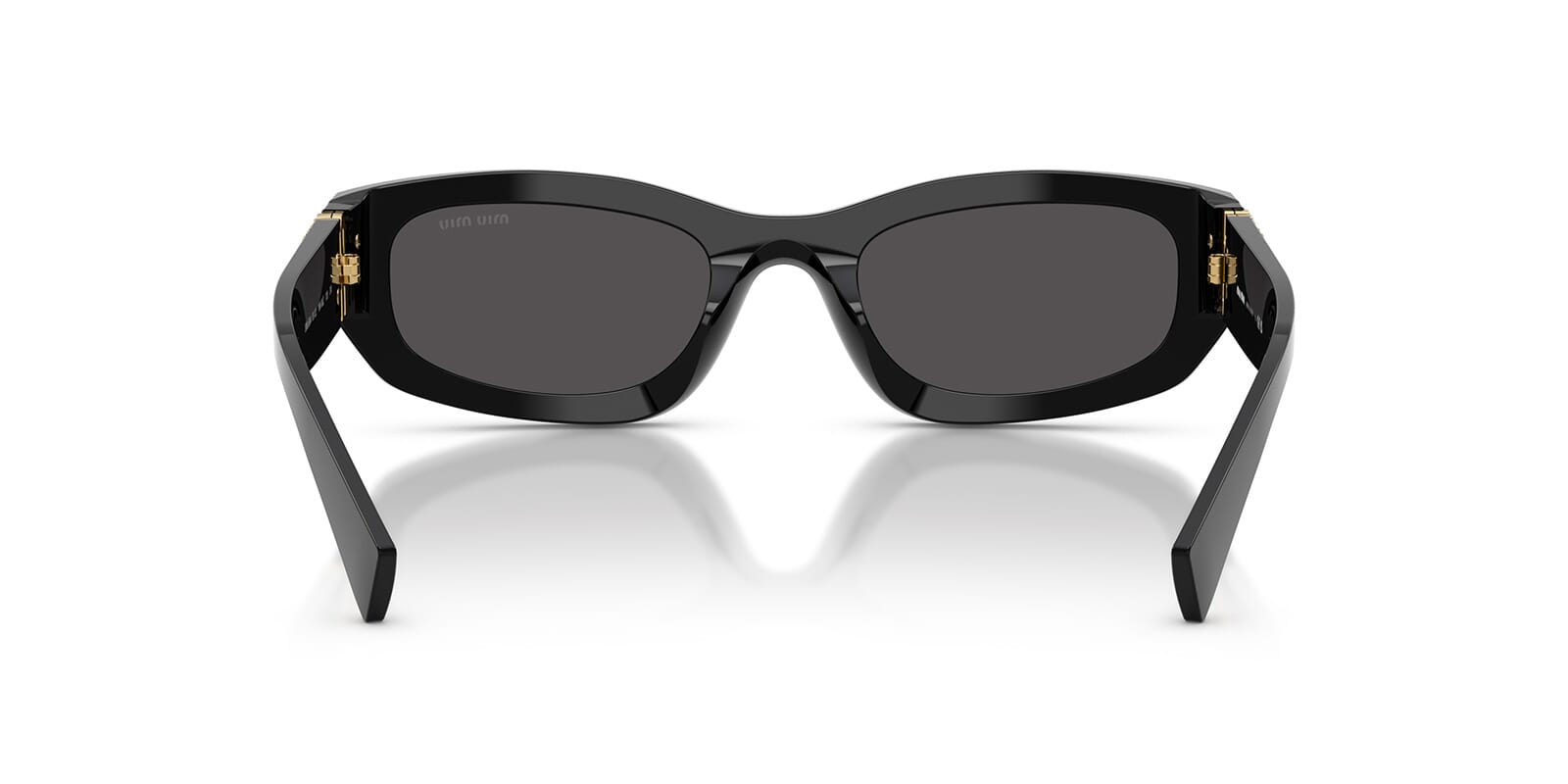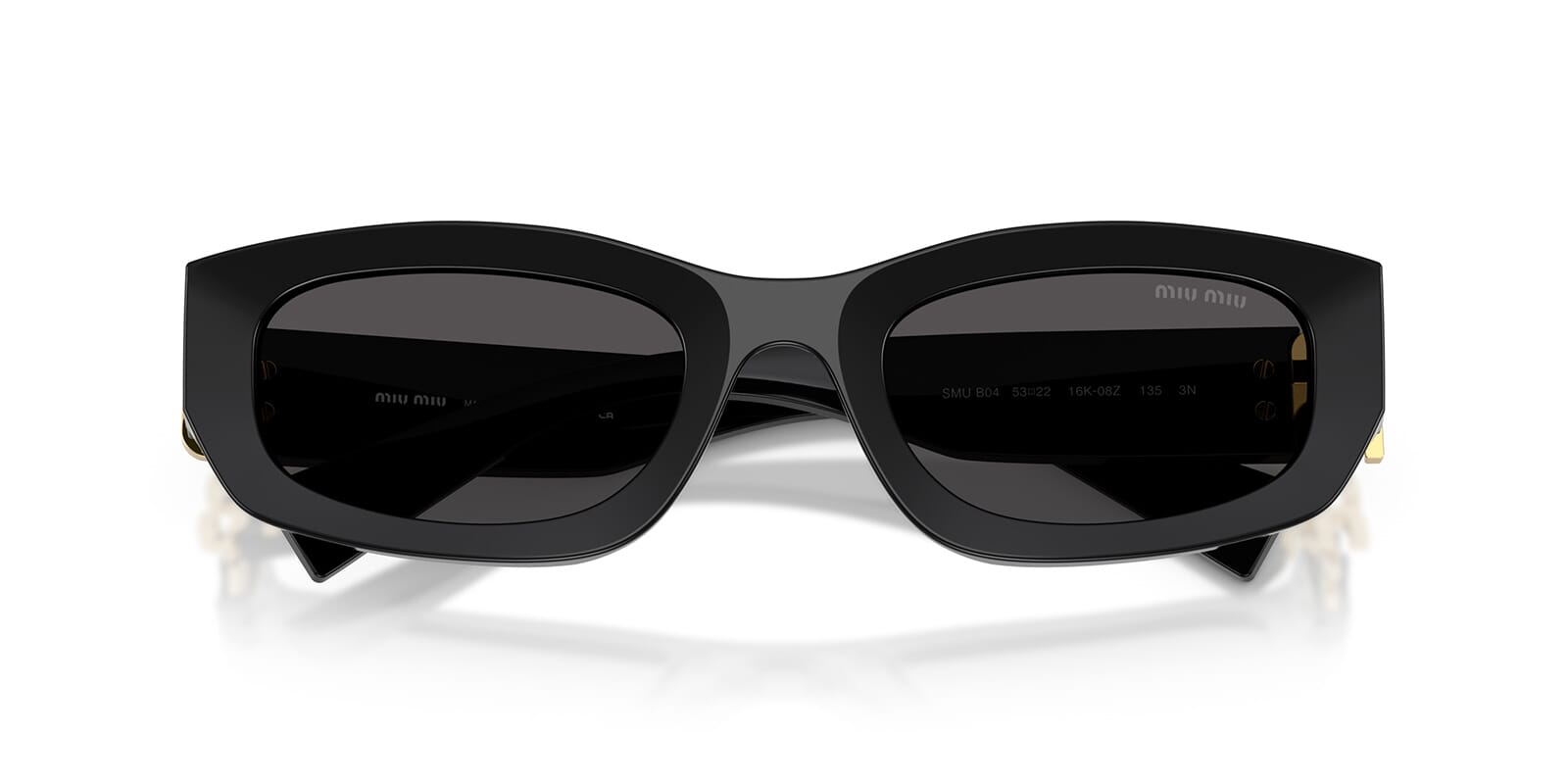 This rectangular Miu Miu sunglass comes in a black frame with dark grey lenses.