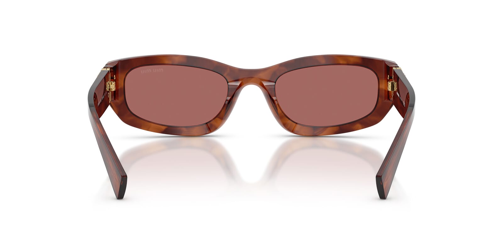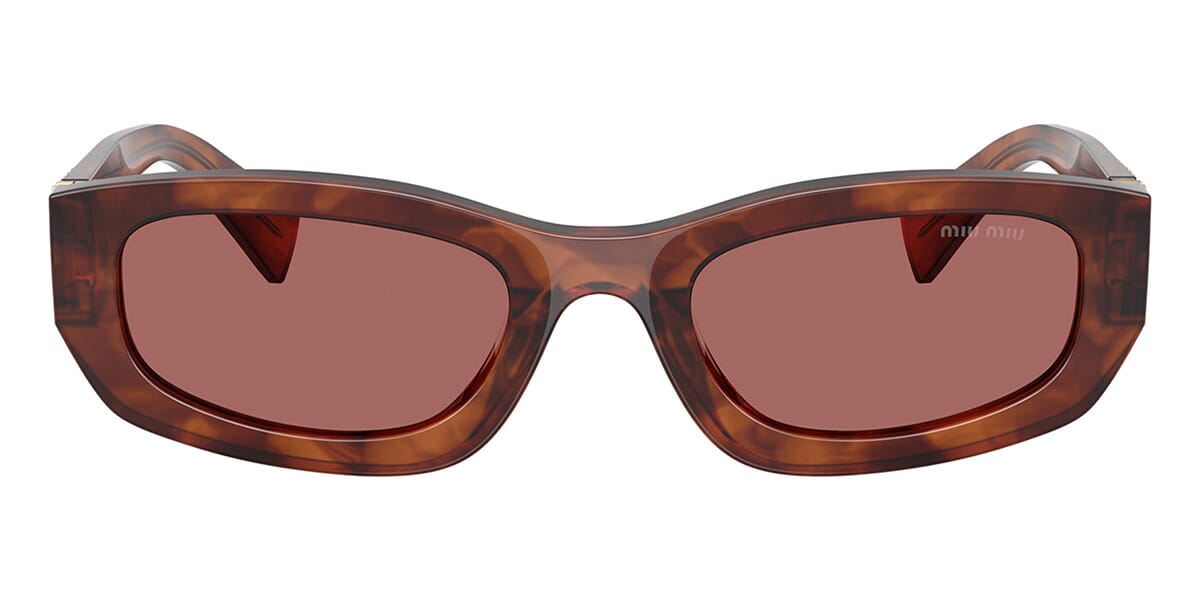This rectangular Miu Miu sunglass comes in a striped tobacco frame with dark violet lenses.