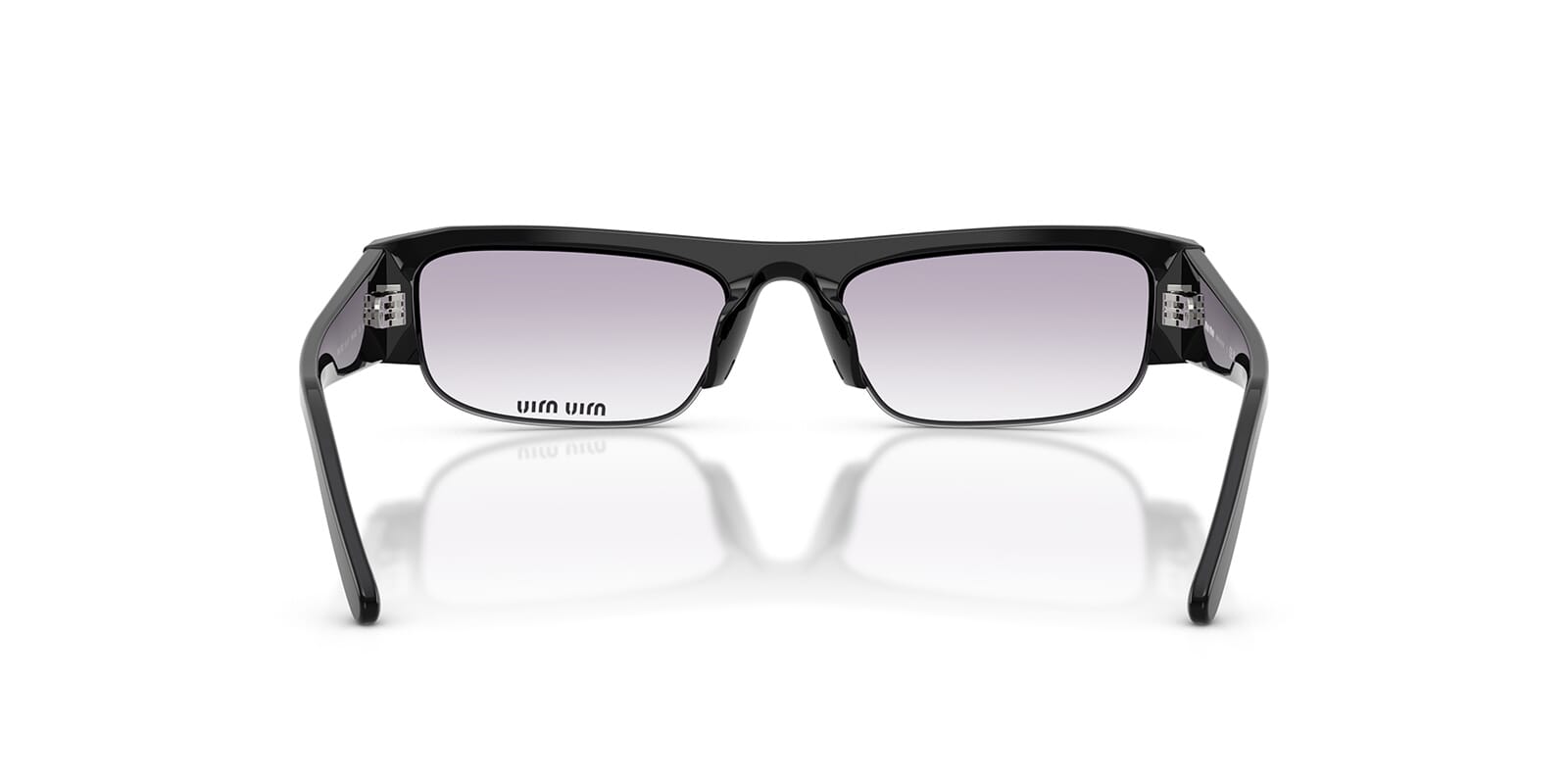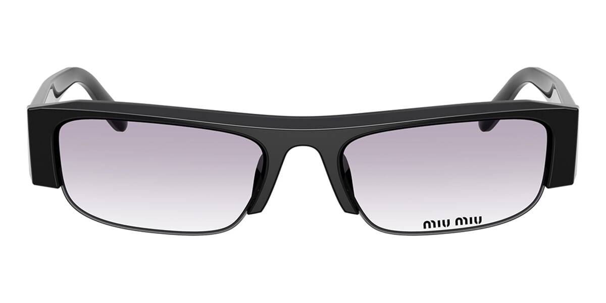 This rectangular Miu Miu sunglass comes in a black frame with clear gradient dark grey lenses.