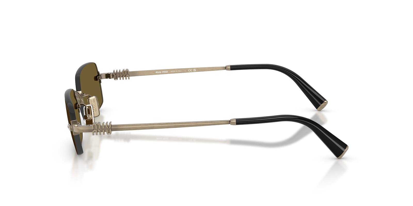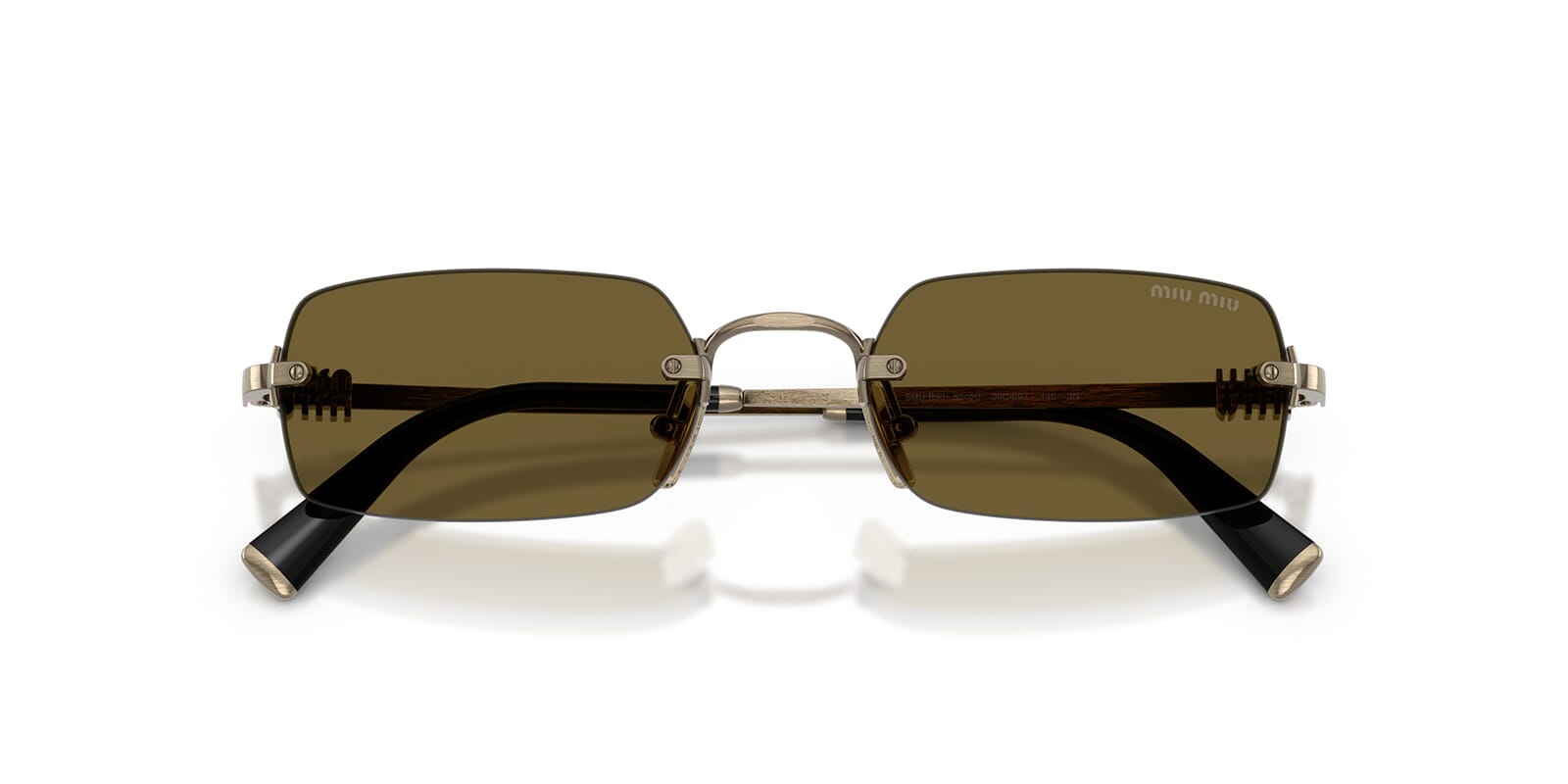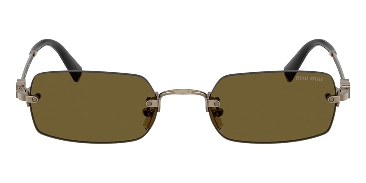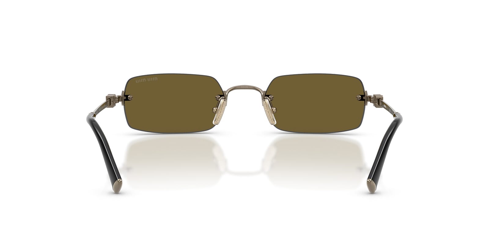 This rectangular Miu Miu sunglass comes in a old gold frame with dark brown lenses.