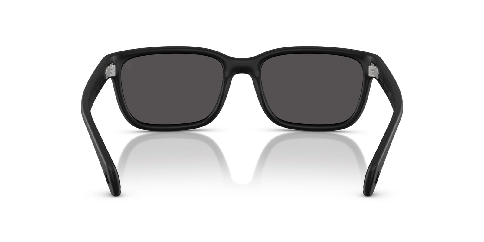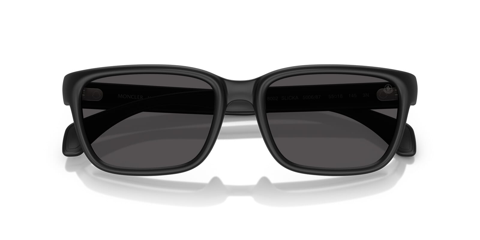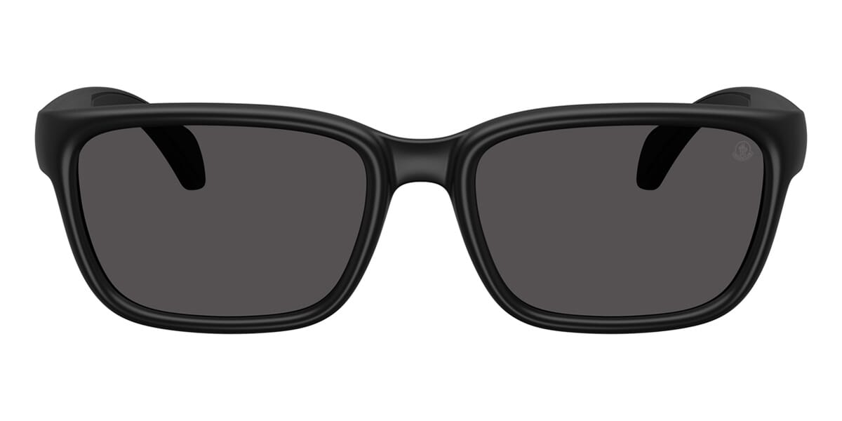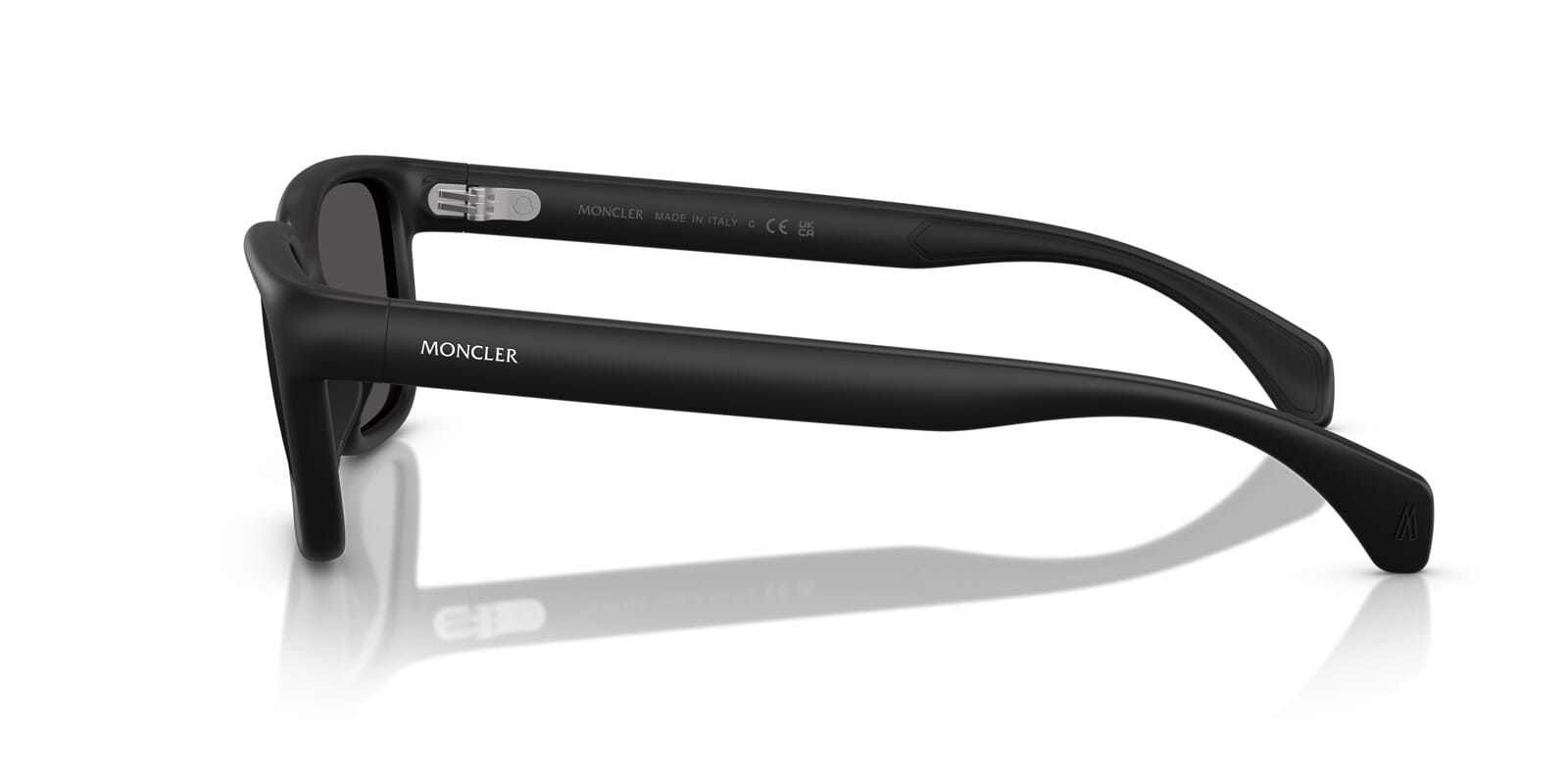 This rectangular Moncler sunglass comes in a matte black frame with dark grey to light grey gradient lenses.