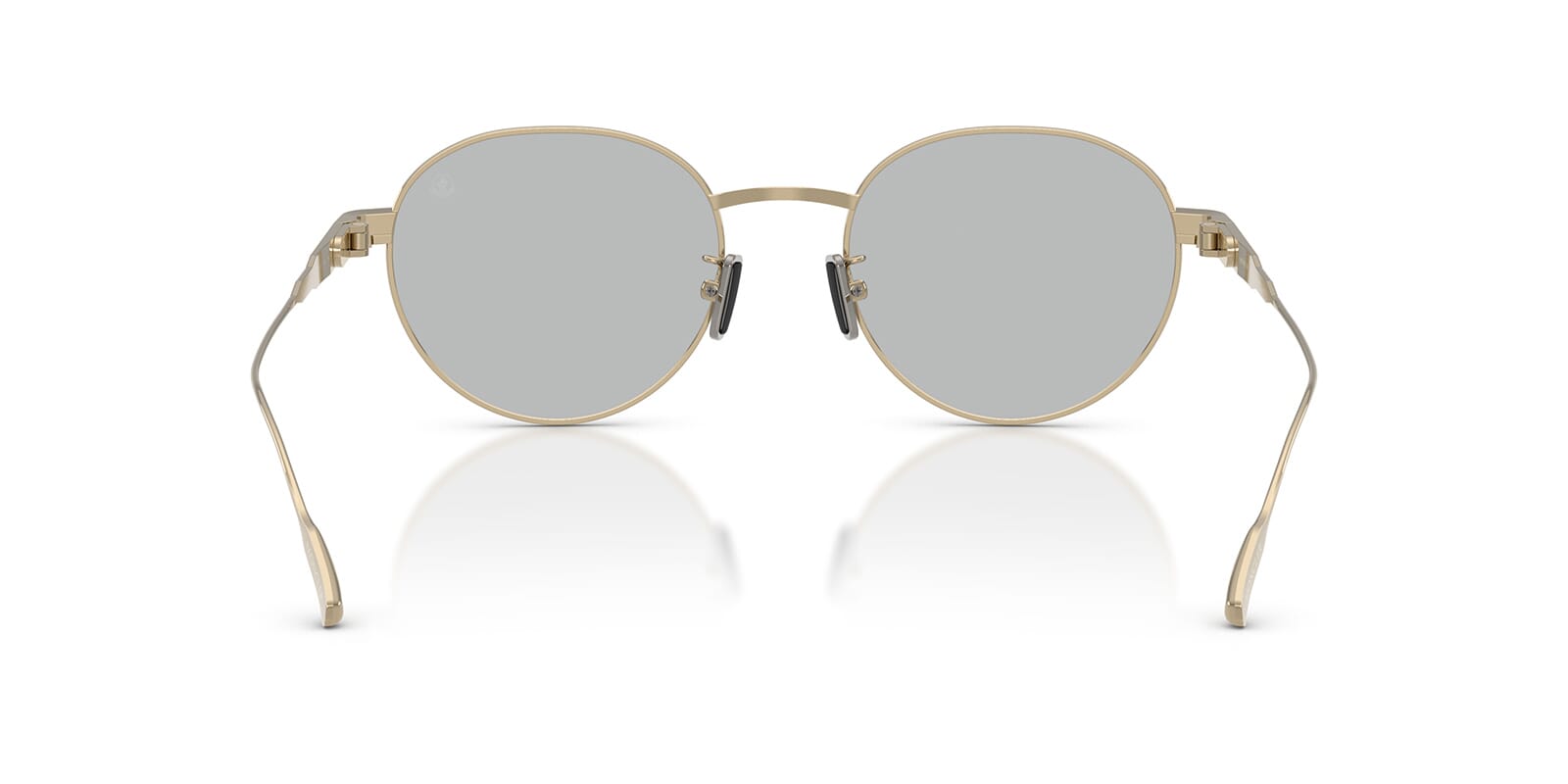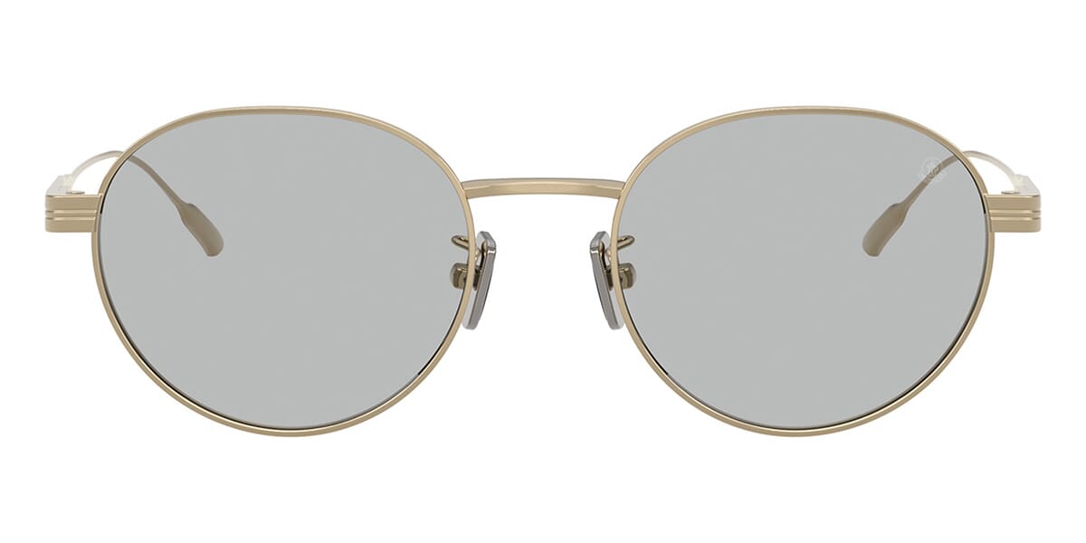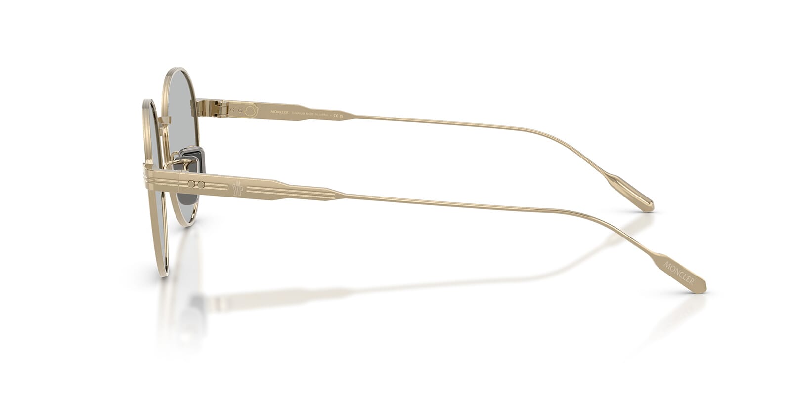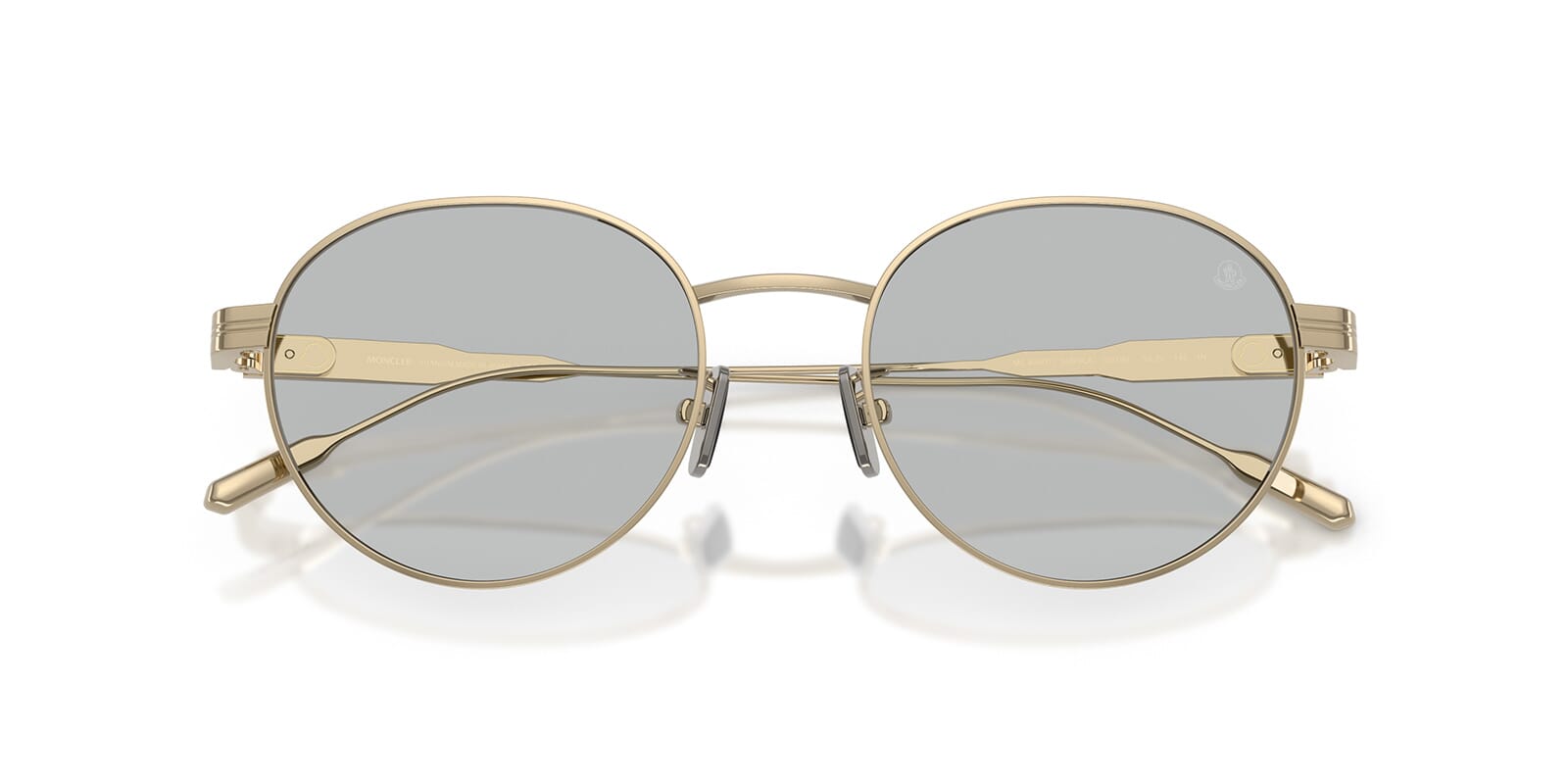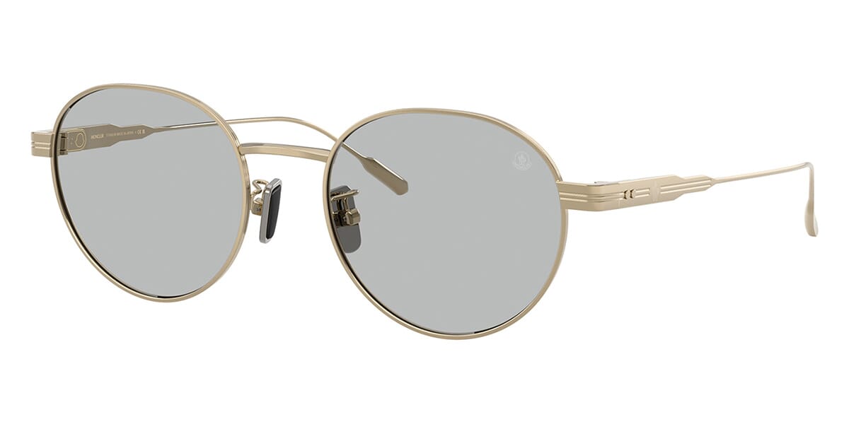 This round Moncler sunglass comes in a shiny pale gold frame with solid grey lenses.