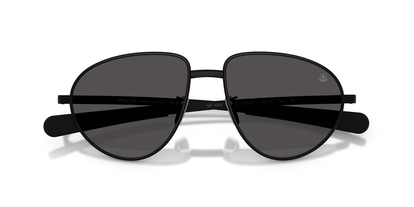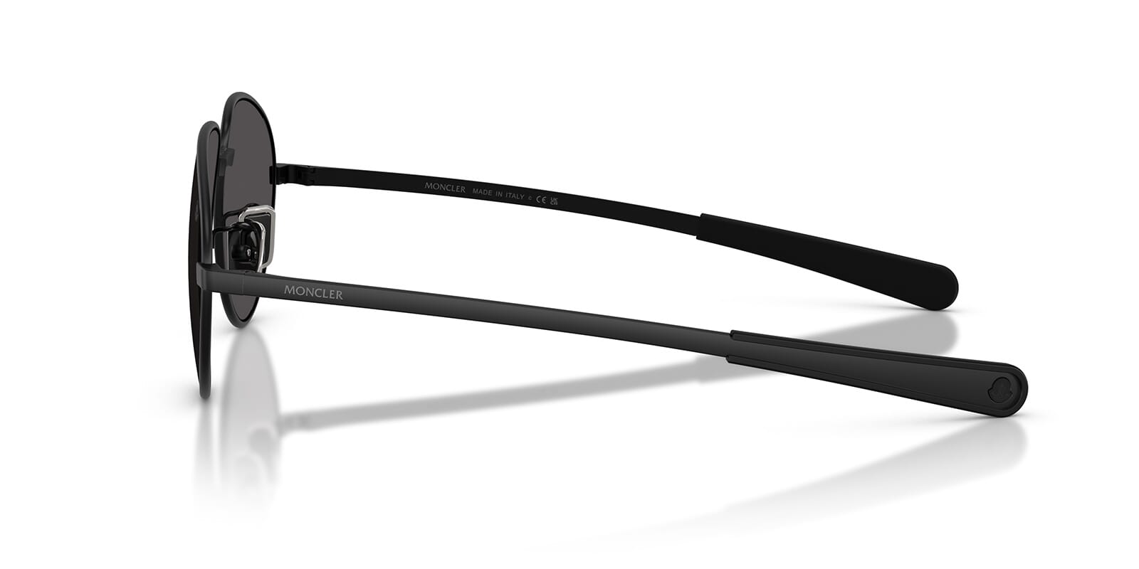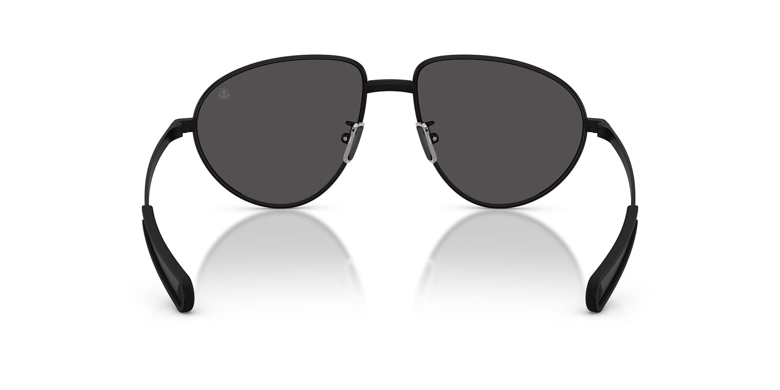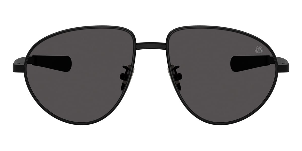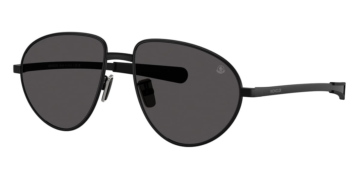 This aviator Moncler sunglass comes in a matte black frame with solid grey lenses.
