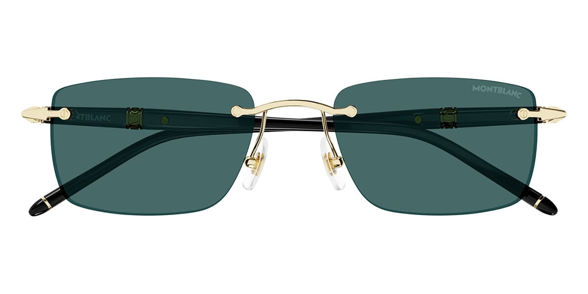 This square Mont Blanc sunglass comes in a shiny light gold frame with green lenses.