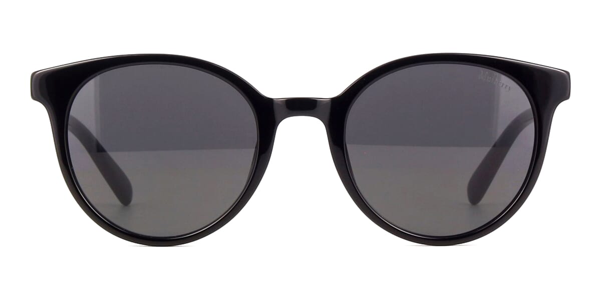 This round Mulberry sunglass comes in a shiny black frame with grey smoke lenses.