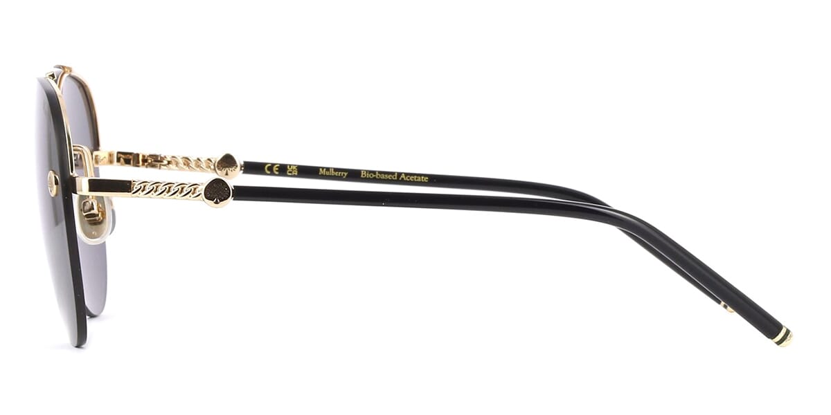 This aviator Mulberry sunglass comes in a shiny black and gold frame with grey with light mirror lenses.