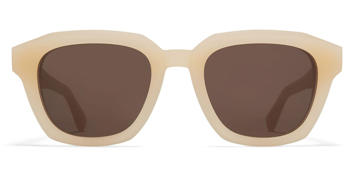 This square Mykita sunglass comes in a chilled raw blonde ivory frame with brown lenses.