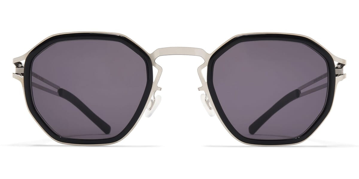 This square Mykita sunglass comes in a shiny silver with black frame with grey lenses.