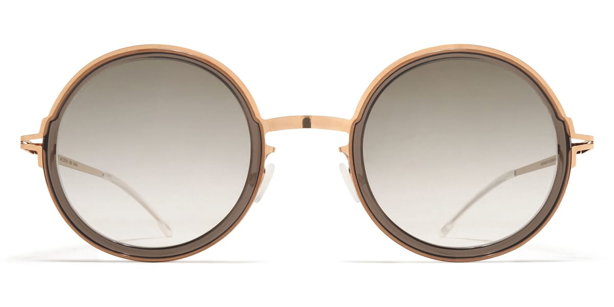 This round Mykita sunglass comes in a champagne gold with clear ash grey frame with grey gradient lenses.