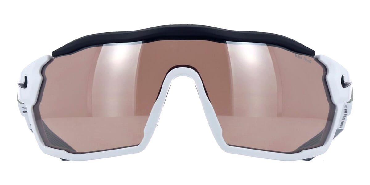 This shield Nike sunglass comes in a shiny white and matte black frame with light brown lenses.