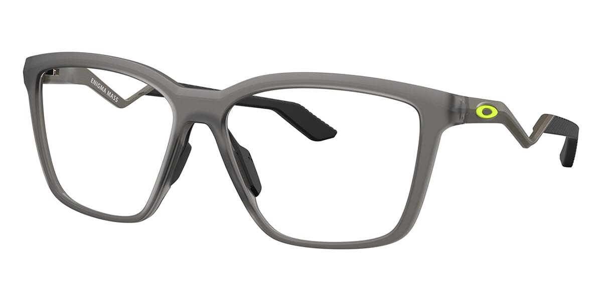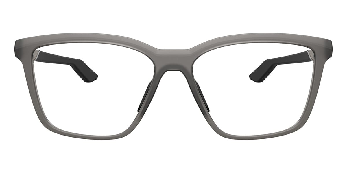 This square Oakley optical comes in a satin grey smoke frame.