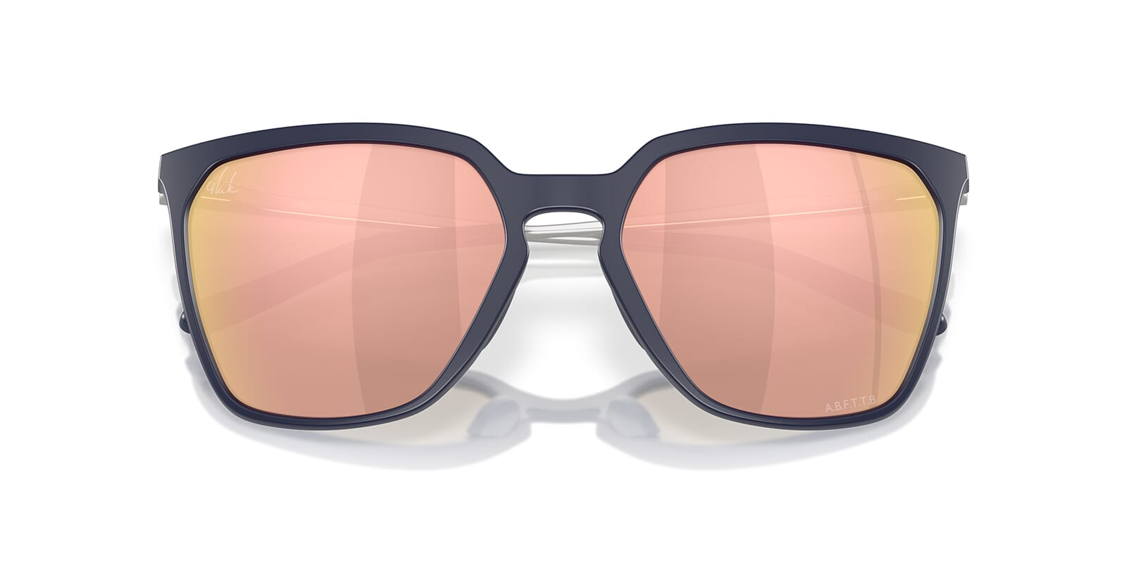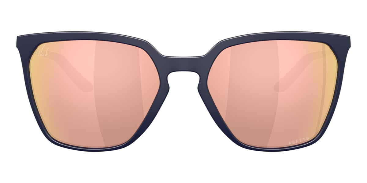 This square Oakley sunglass comes in a matte navy frame with prizm rose gold lenses.