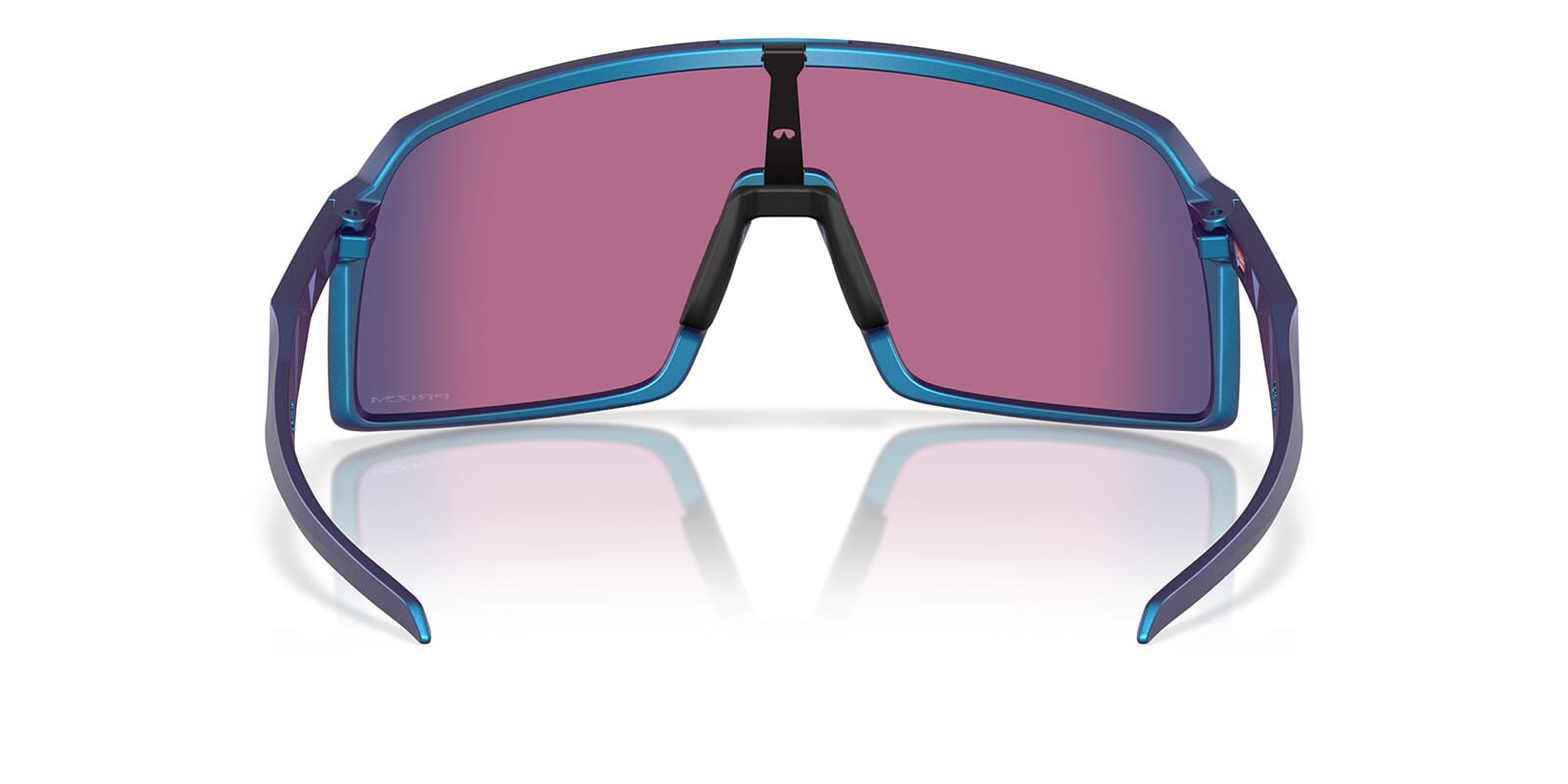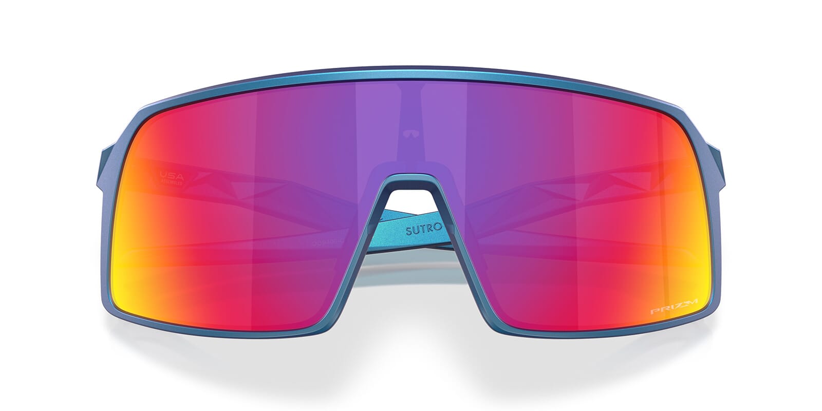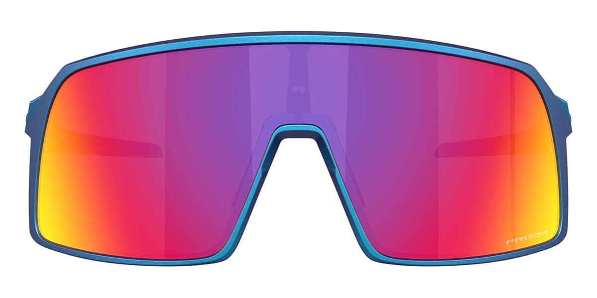 This shield Oakley sunglass comes in a matte cyan and blue colorshift frame with prizm road lenses.