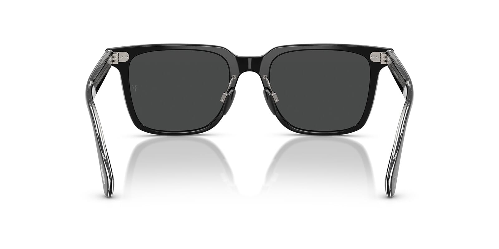 This square Oliver Peoples sunglass comes in a black frame with dark slate lenses.