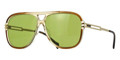 This square Oliver Peoples sunglass comes in a buff frame with green c lenses.