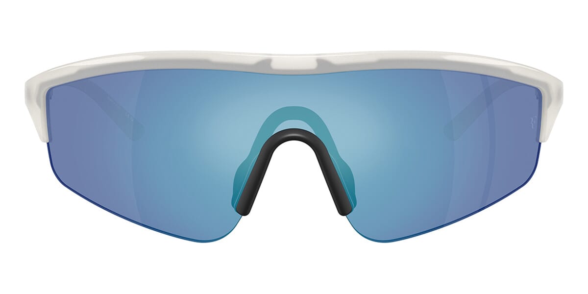 This rectangular Oliver Peoples sunglass comes in a warm white frame with marine flash mirror lenses.