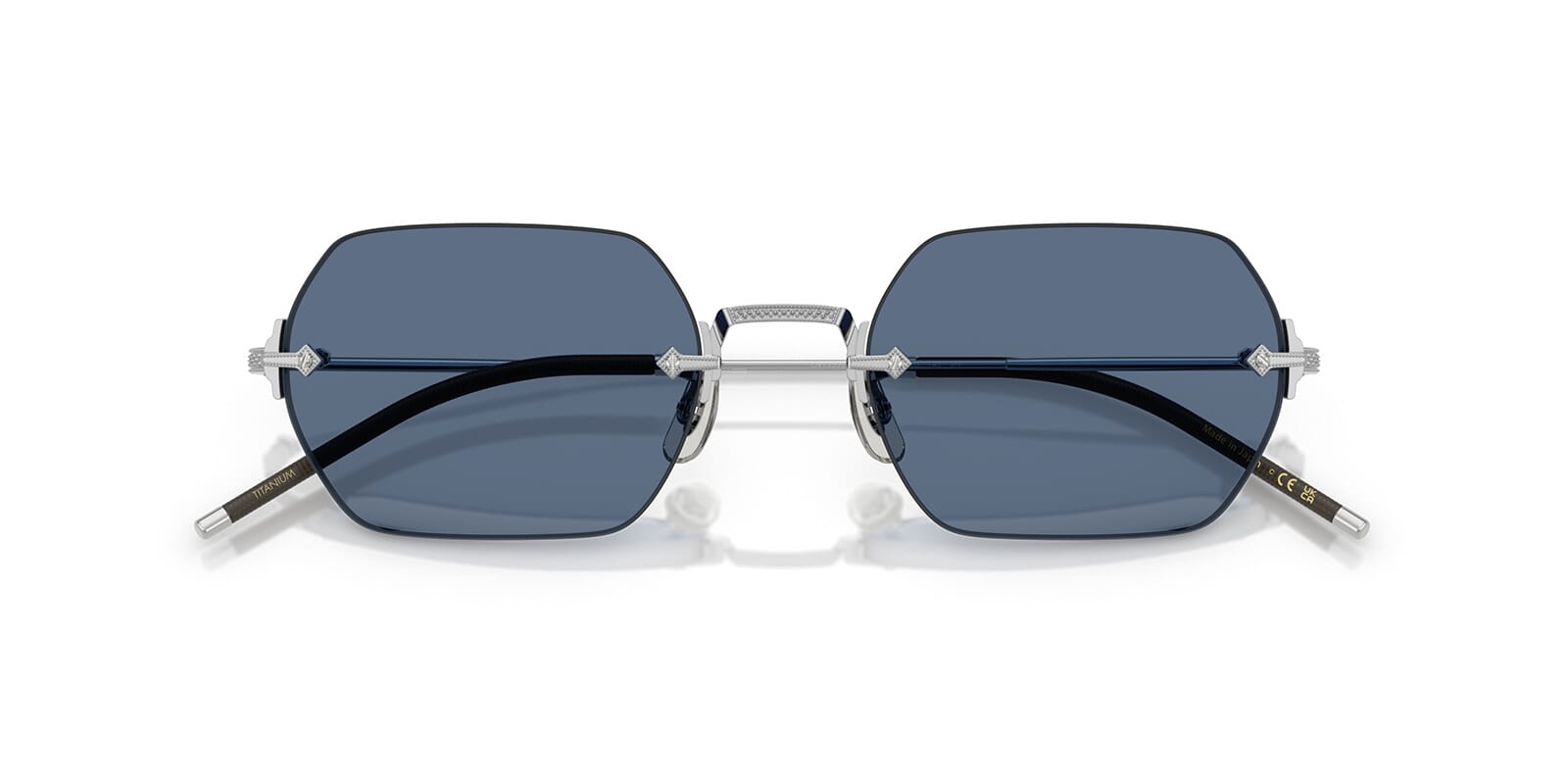 This rectangular Oliver Peoples sunglass comes in a silver frame with blue lenses.