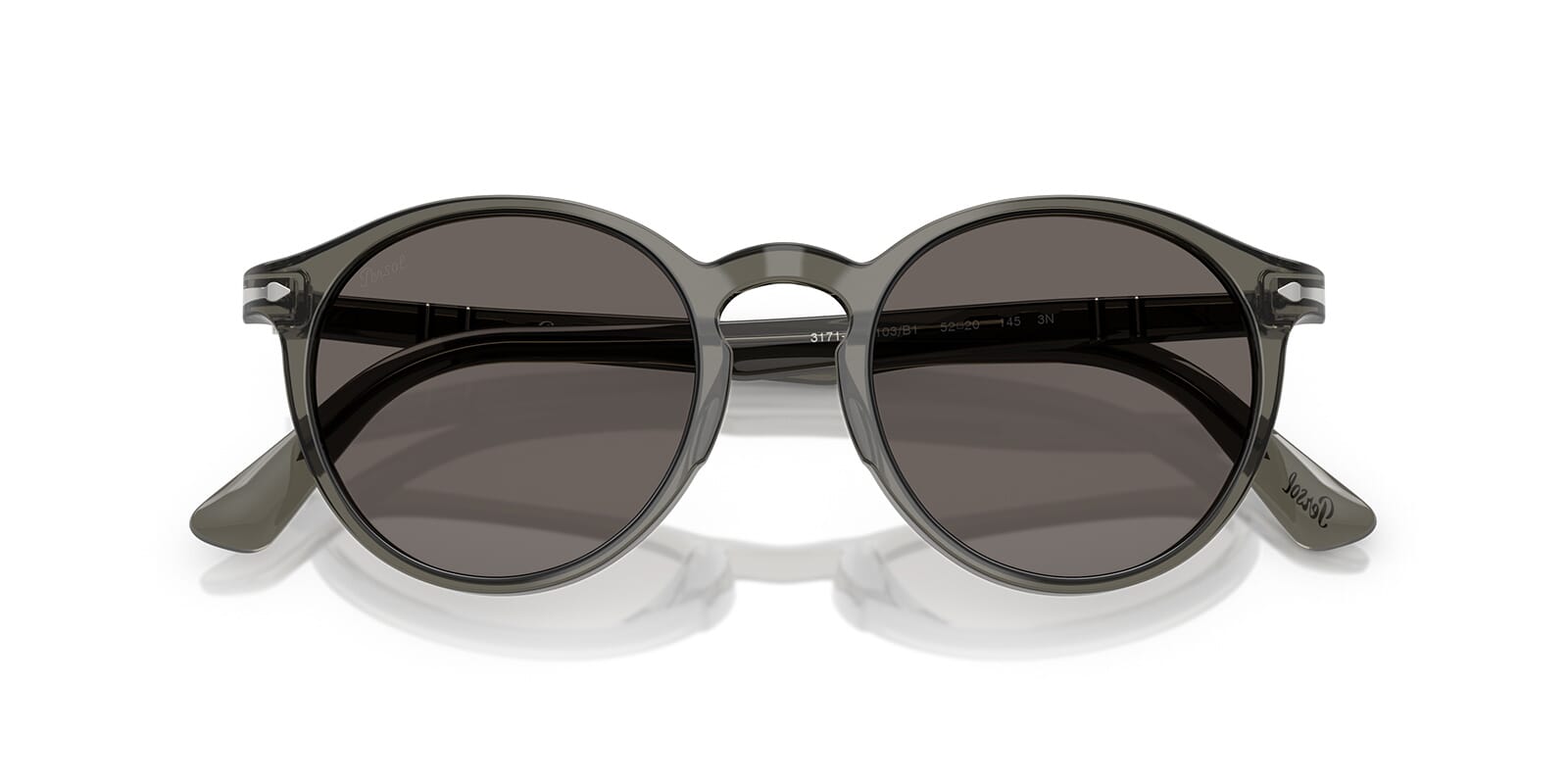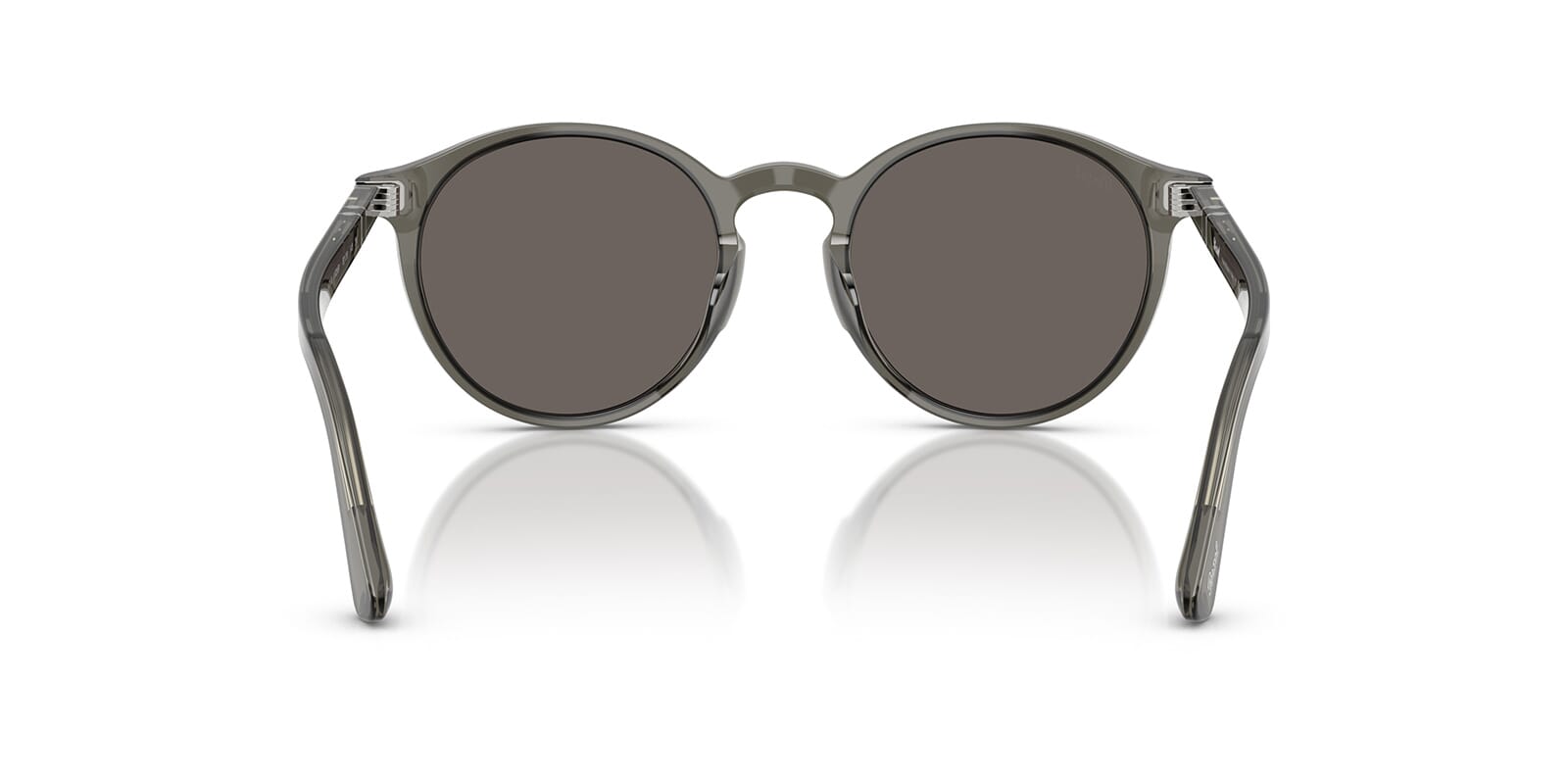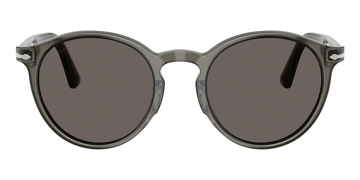 This round Persol sunglass comes in a taupe grey transparent frame with dark grey lenses.