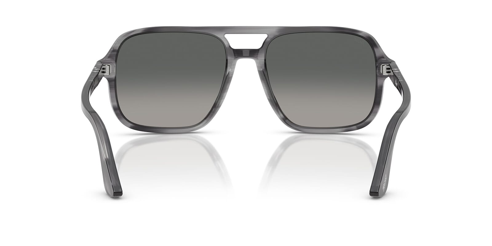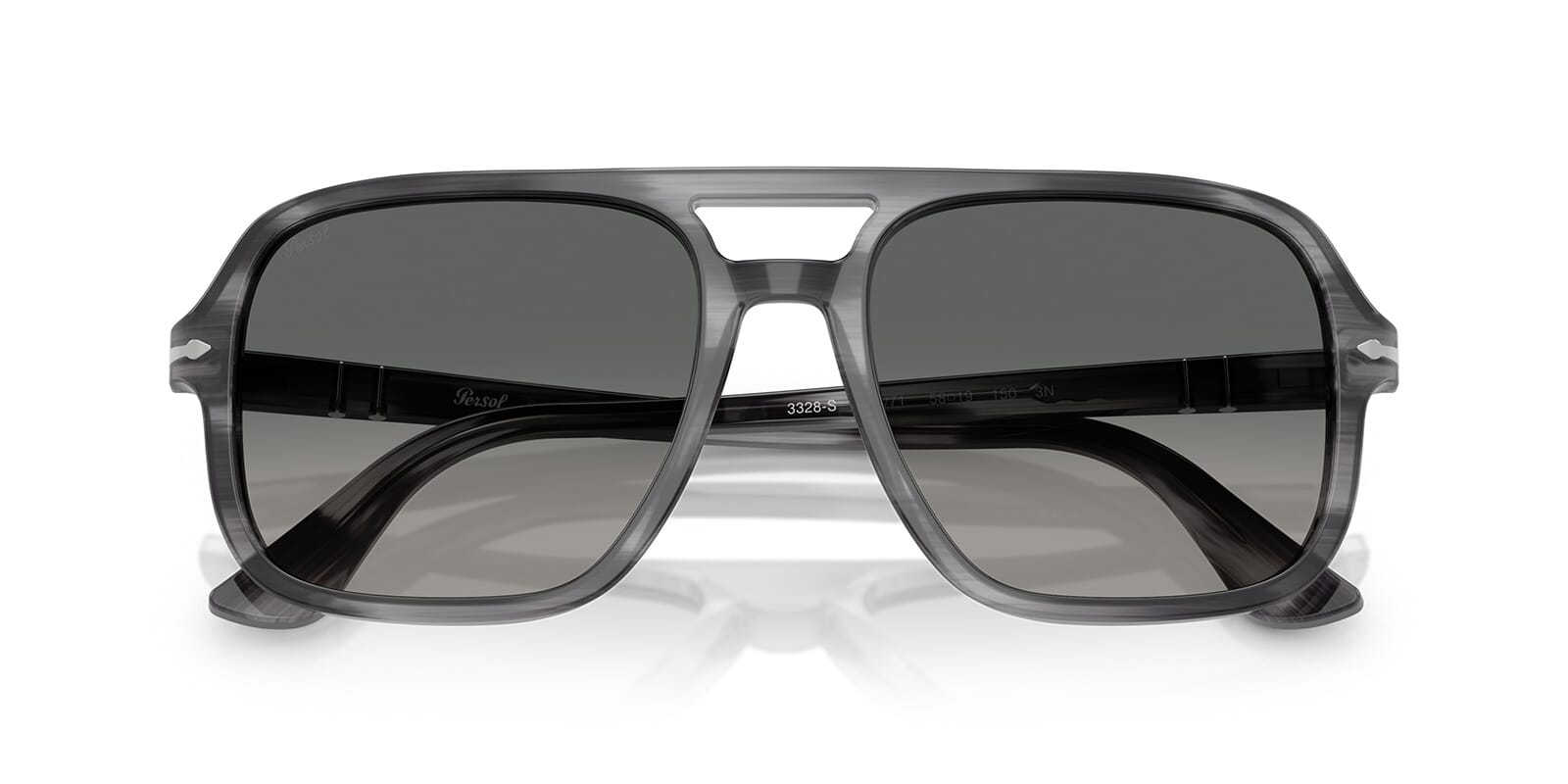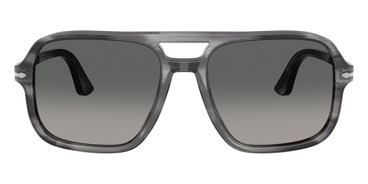 This aviator Persol sunglass comes in a striped grey frame with dark grey gradient lenses.