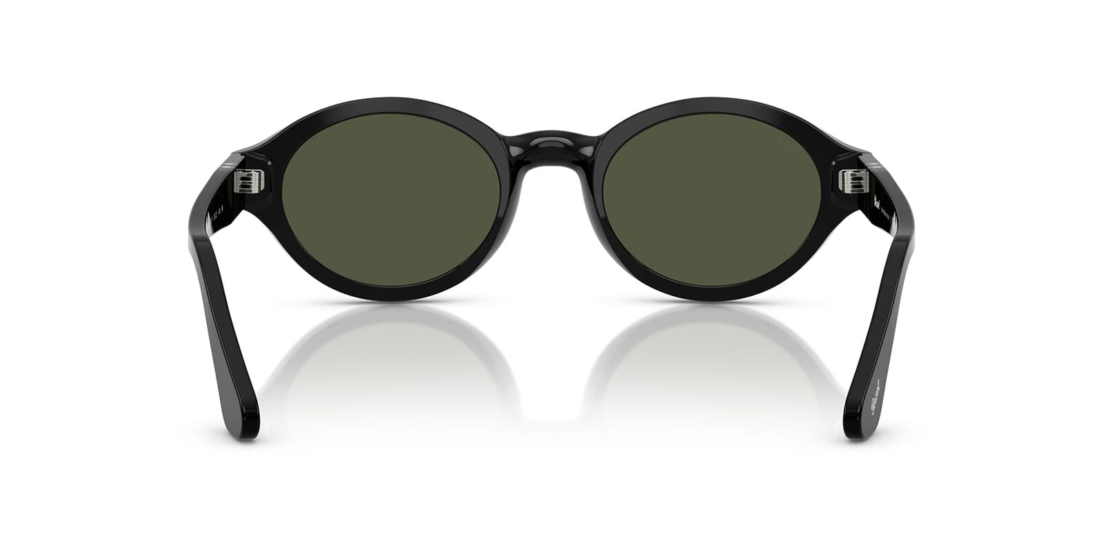 This round Persol sunglass comes in a black frame with green lenses.