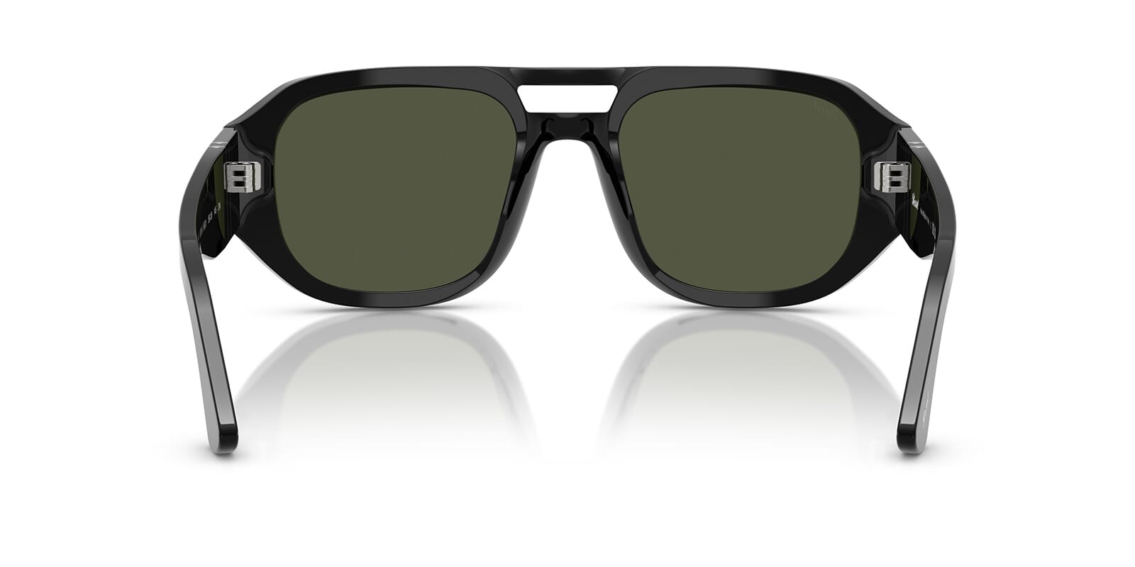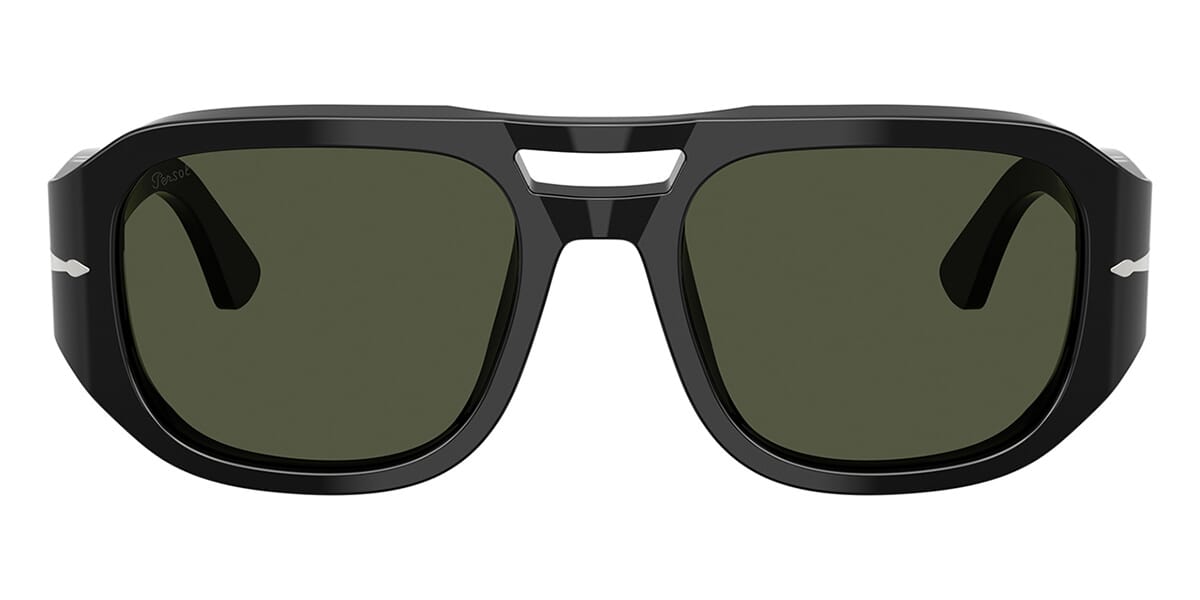 This aviator Persol sunglass comes in a black frame with green lenses.