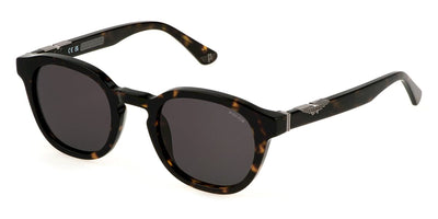This round Police sunglass comes in a shiny black and gold frame with grey polarised lenses.