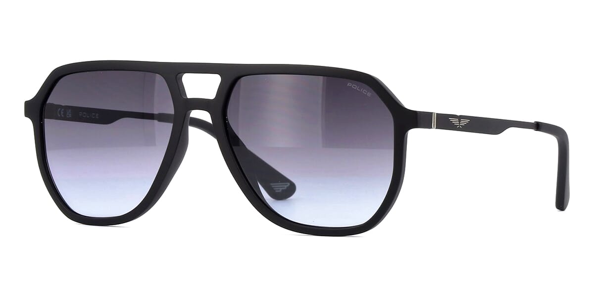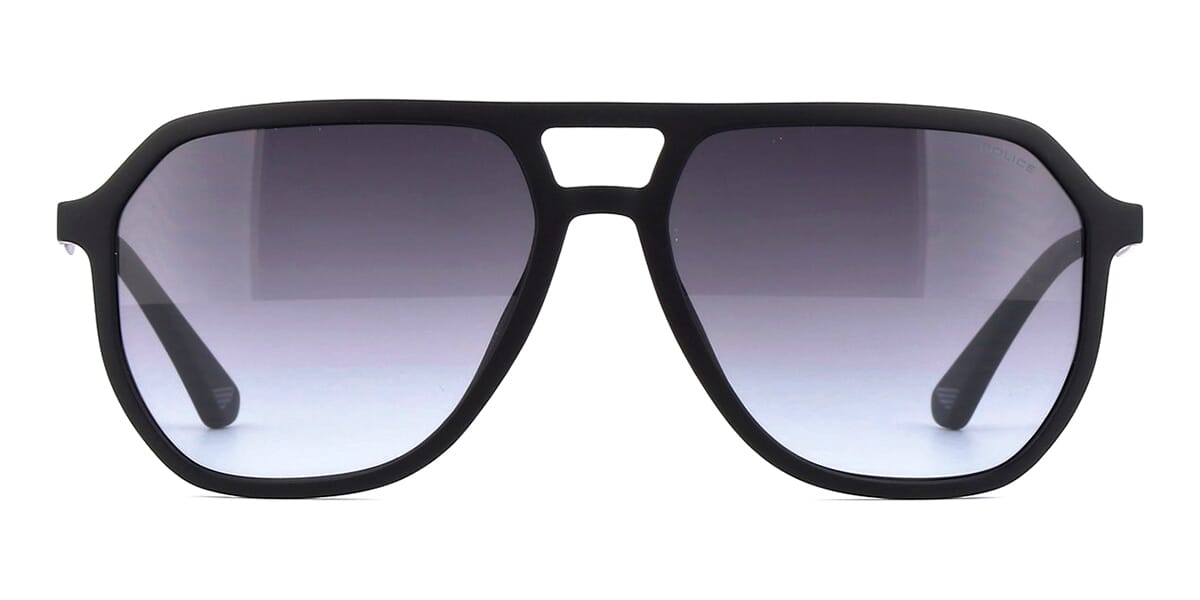 This square Police sunglass comes in a matte black frame with grey to clear gradient lenses.