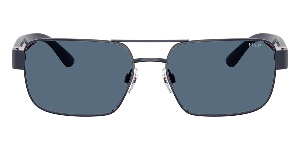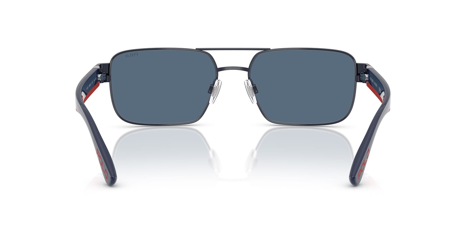 This rectangular Polo sunglass comes in a shiny navy blue frame with dark blue lenses.