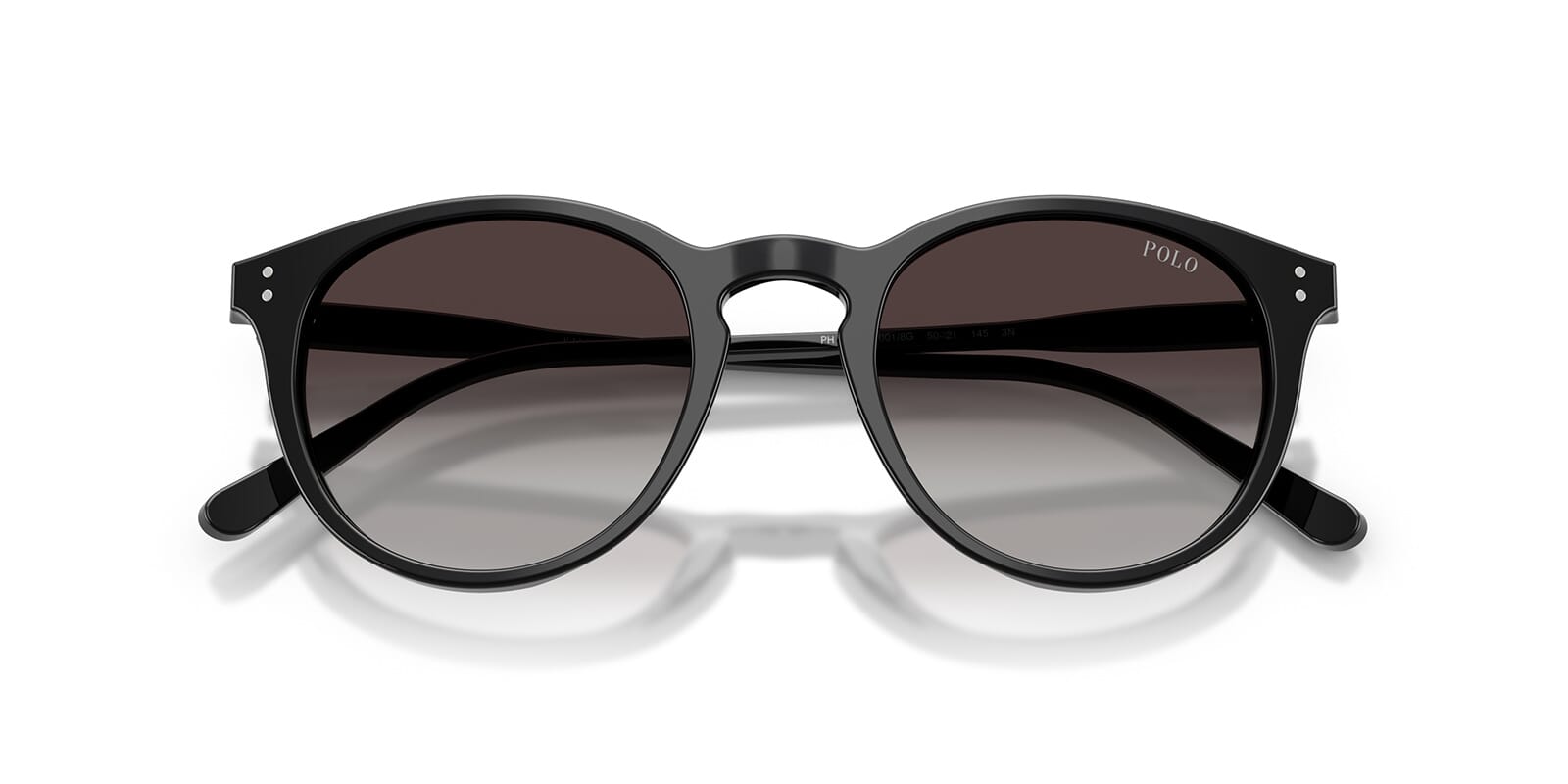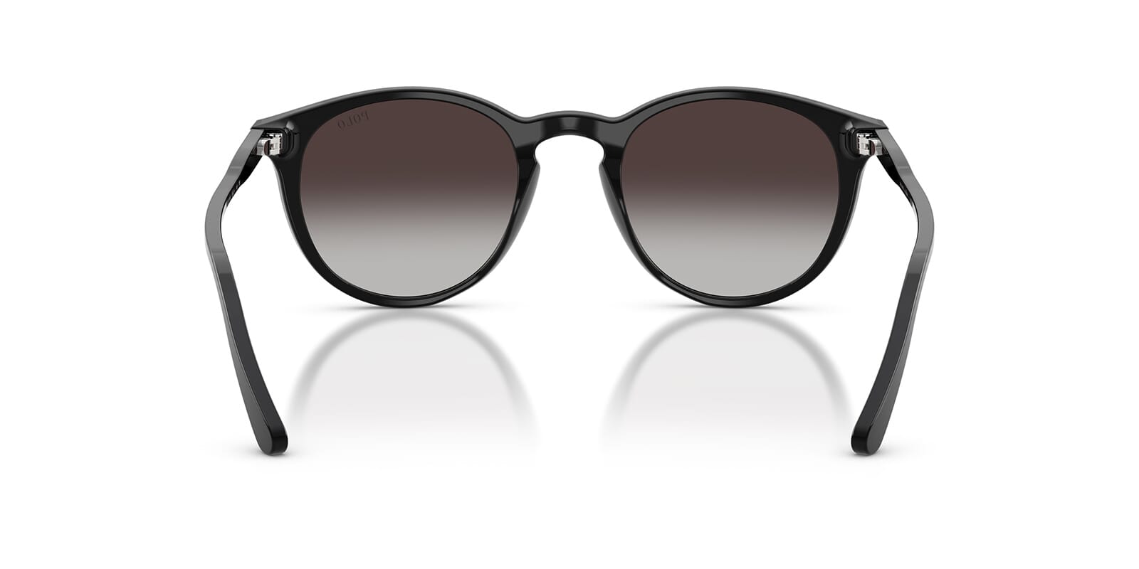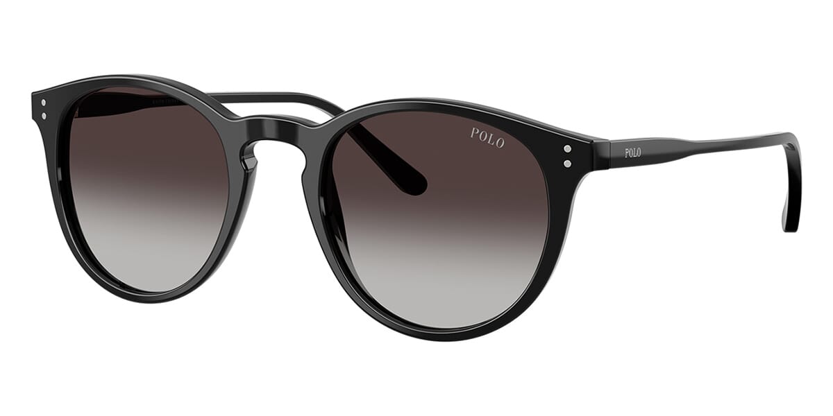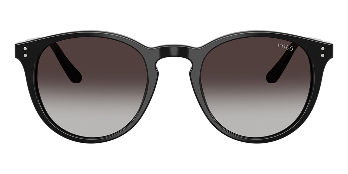 This round Polo sunglass comes in a shiny black frame with grey gradient lenses.