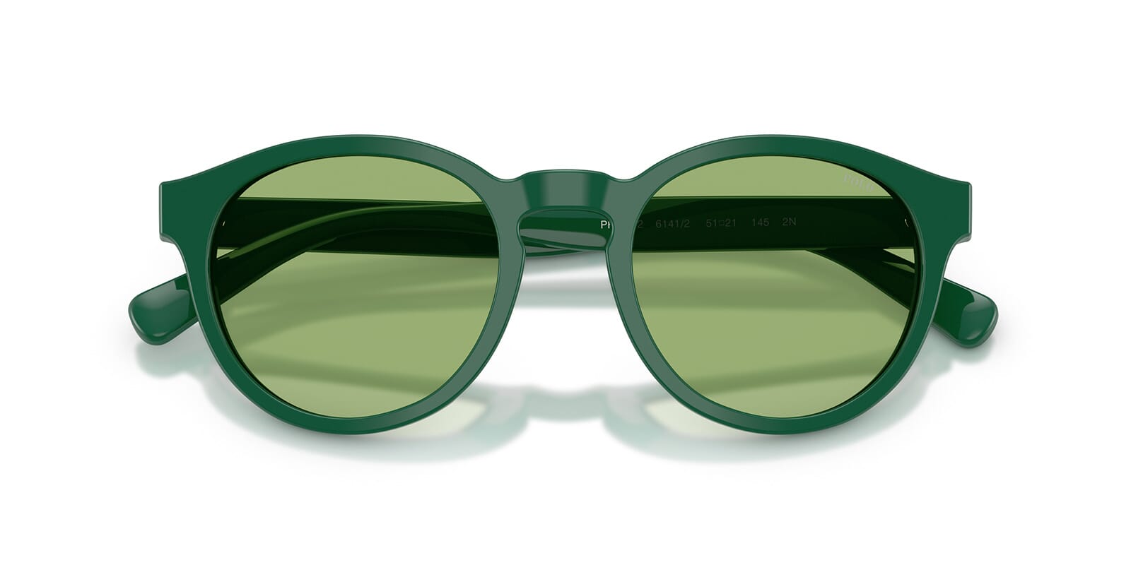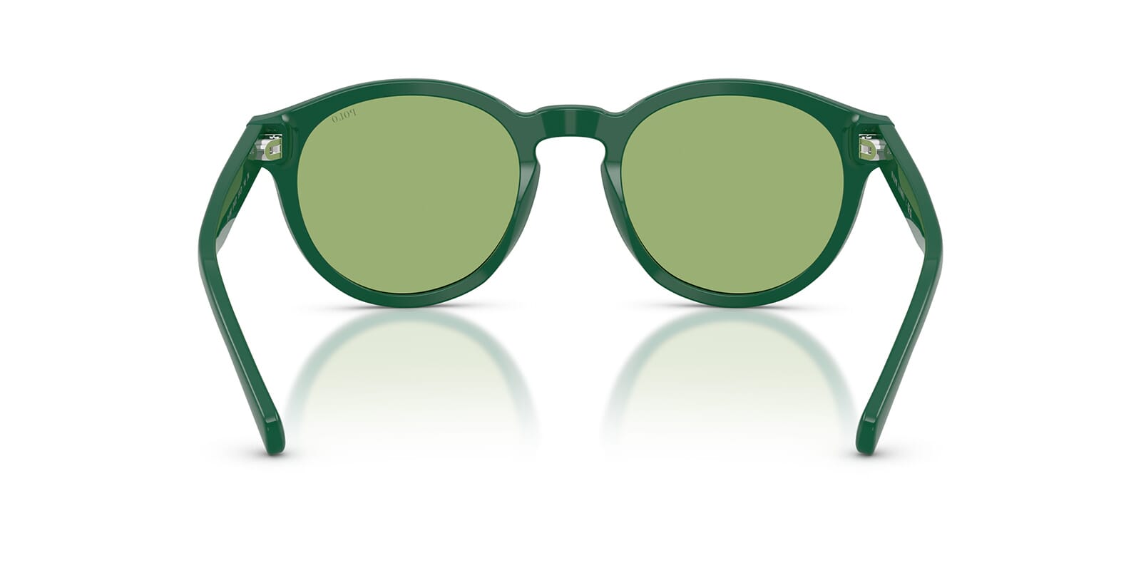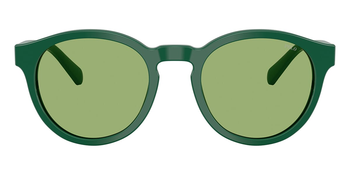 This round Polo sunglass comes in a shiny dark green frame with light green lenses.