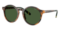 This round Polo sunglass comes in a shiny brown tortoise frame with bottle green lenses.