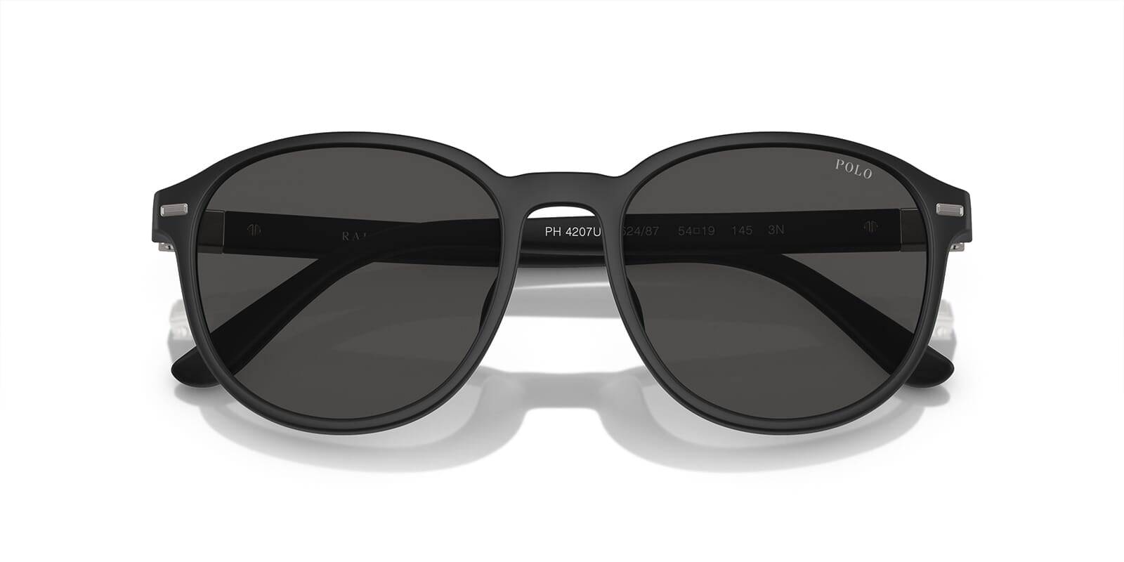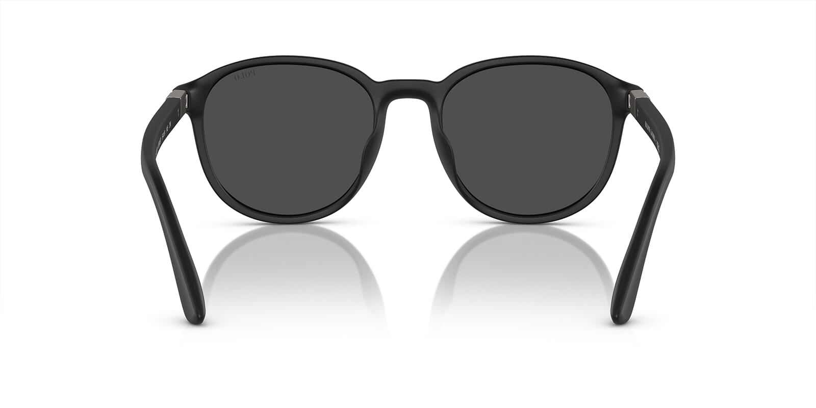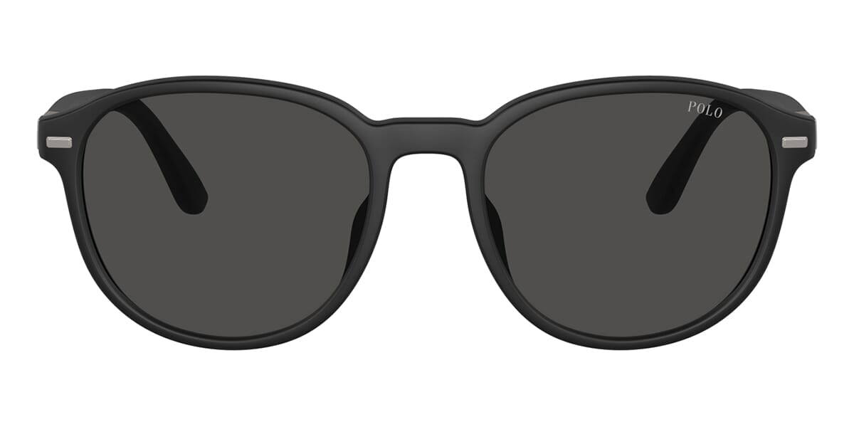 This round Polo sunglass comes in a matte black frame with grey lenses.