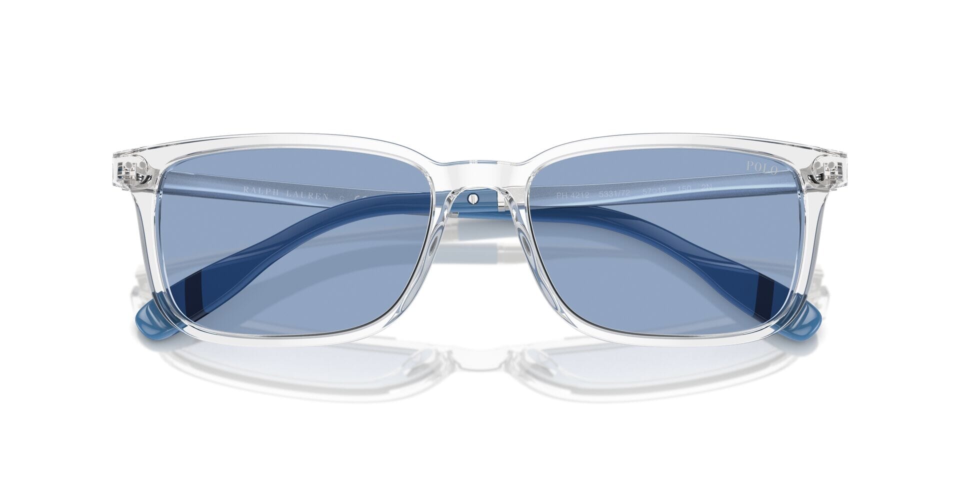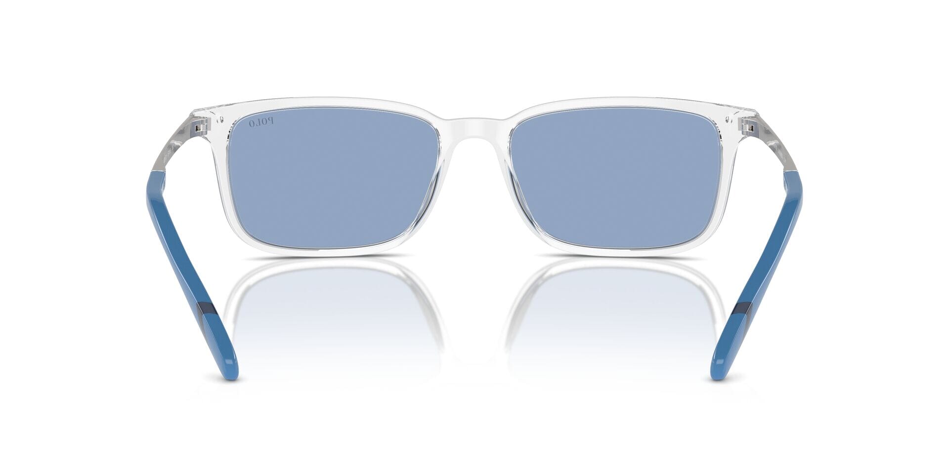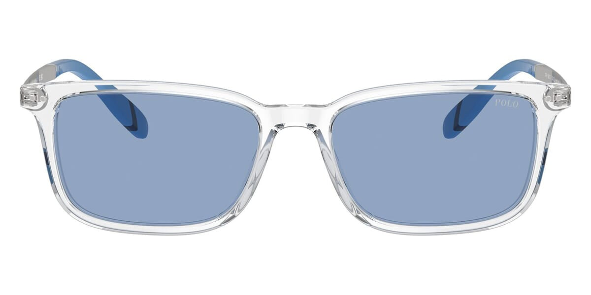 This rectangular Polo sunglass comes in a shiny crystal frame with light blue lenses.